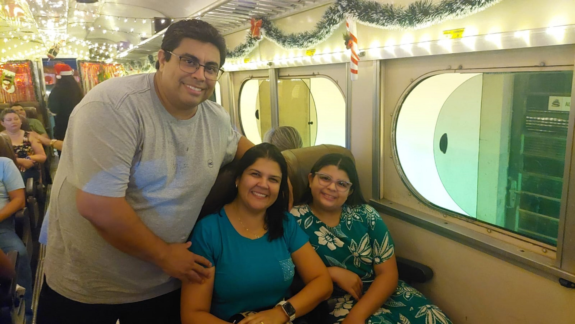 A Manuela Gobbo Cesar, de 11 anos, estava toda ansiosa para subir no trem pela primeira vez e nos contou que a iniciativa de embarcar partiu dela. “Vi nas redes sociais o passeio, pedi para os meus pais e eles realizaram meu desejo. Sempre via nos filmes os trens e tinha vontade de saber como era por dentro e passear neles”, disse a estudante. Viver a experiência com a época que a pequena mais gosta também é um ponto positivo. “O Natal é muito legal, é a mais divertida pra mim. Ver um trem iluminado de natal é mais legal ainda e já vi o Papai Noel por aí também”, complementou Manu, que foi acompanhada dos papais Simone Gobbo e Filipe Silva Cesar.