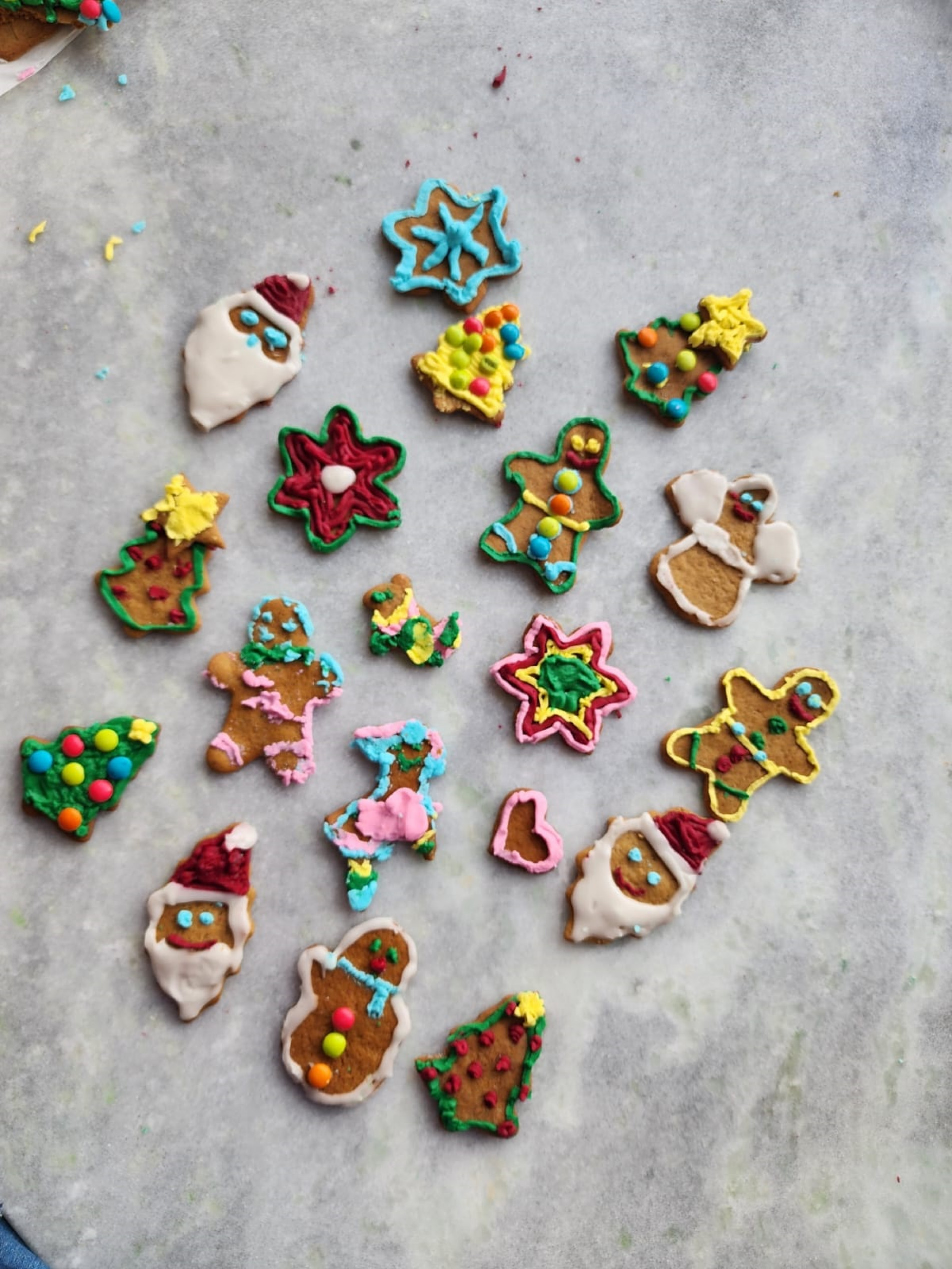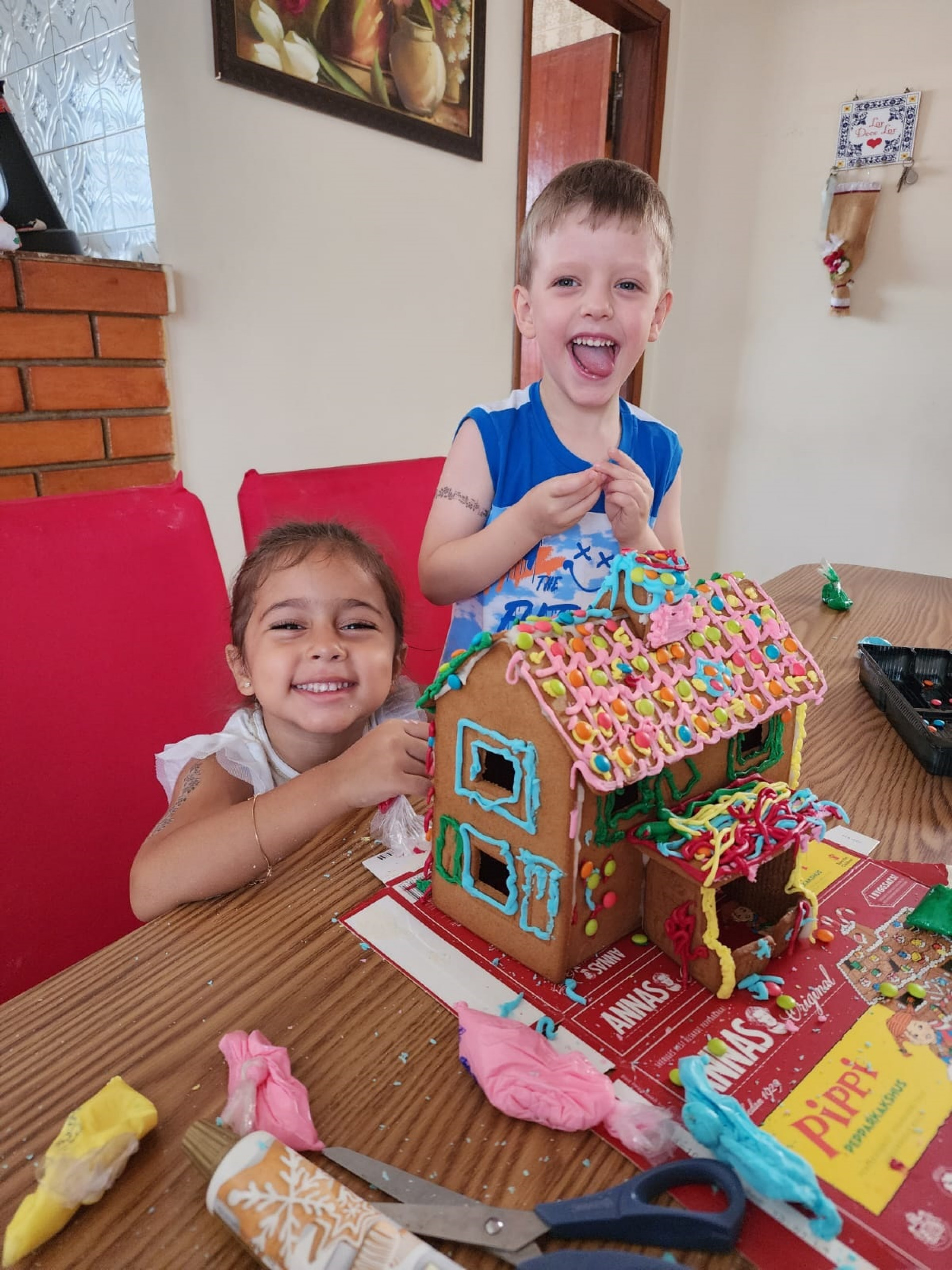 Apesar das festas íntimas e simples, a pequena Laura Trentin Gomes, de quatro aninhos, teve uma experiência muito legal pouco antes do dia 25 de dezembro: fez a clássica casa de biscoitos (muito comum nos Estados Unidos) com a presença de seu primo Albert, da Suécia. Os biscoitos natalinos, chamados de gingerbread, também foram pro forninho.