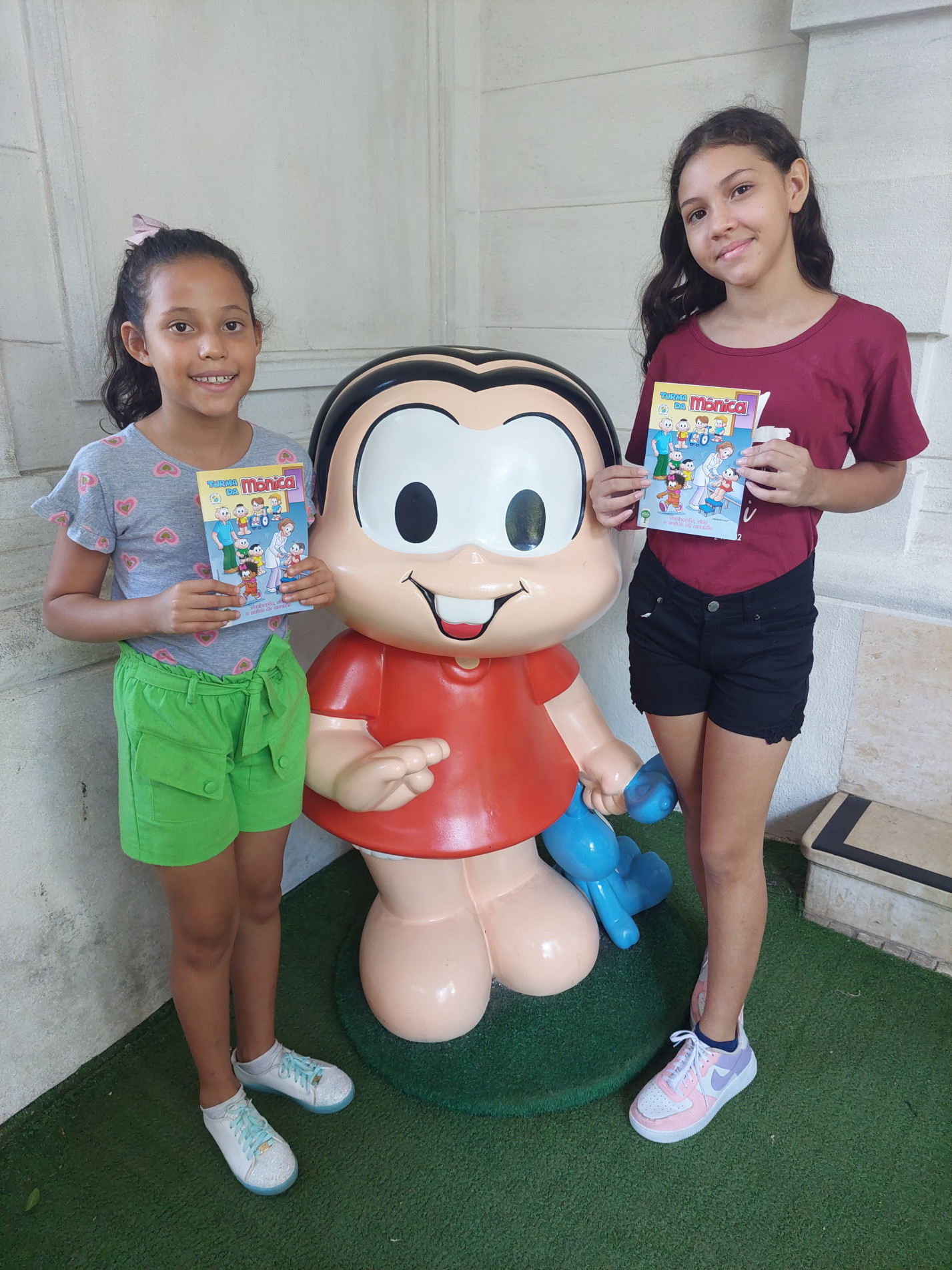 Hora de dar tchau, mas não sem antes conversar com uma duplinha. Kamilly Victória Cardoso Sousa, de 10 anos e Beatriz Castro de Oliveira Cardoso, de nove, se apaixonaram pelos desenhos de “antes e depois” da Mônica. “Já conhecia alguns, mas o que tem aqui são bem diferentes e legais, amei”, disse Kamilly.
