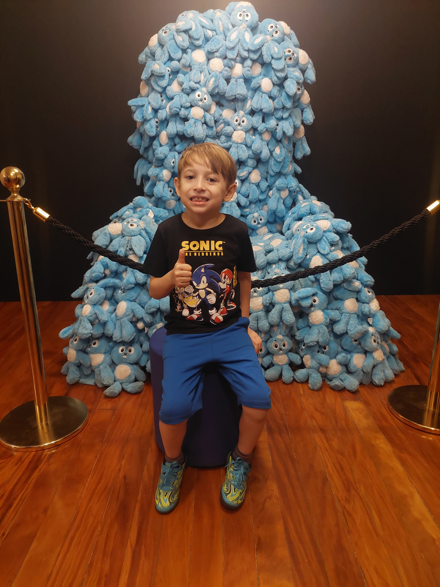 Hora de subir para o terceiro e último andar. Digamos que a Mônica sem o Sansão é como um avião sem asas -- um pouco sem sentido. Já que esse personagem é tão icônico na história, ele não ganhou apenas uma sessão, mas sim uma poltrona digna de rei com centenas dele. Quem teve o prazer de chegar pertinho dele foi o Heitor Jonatas Carvalho Bauman, de oito anos.