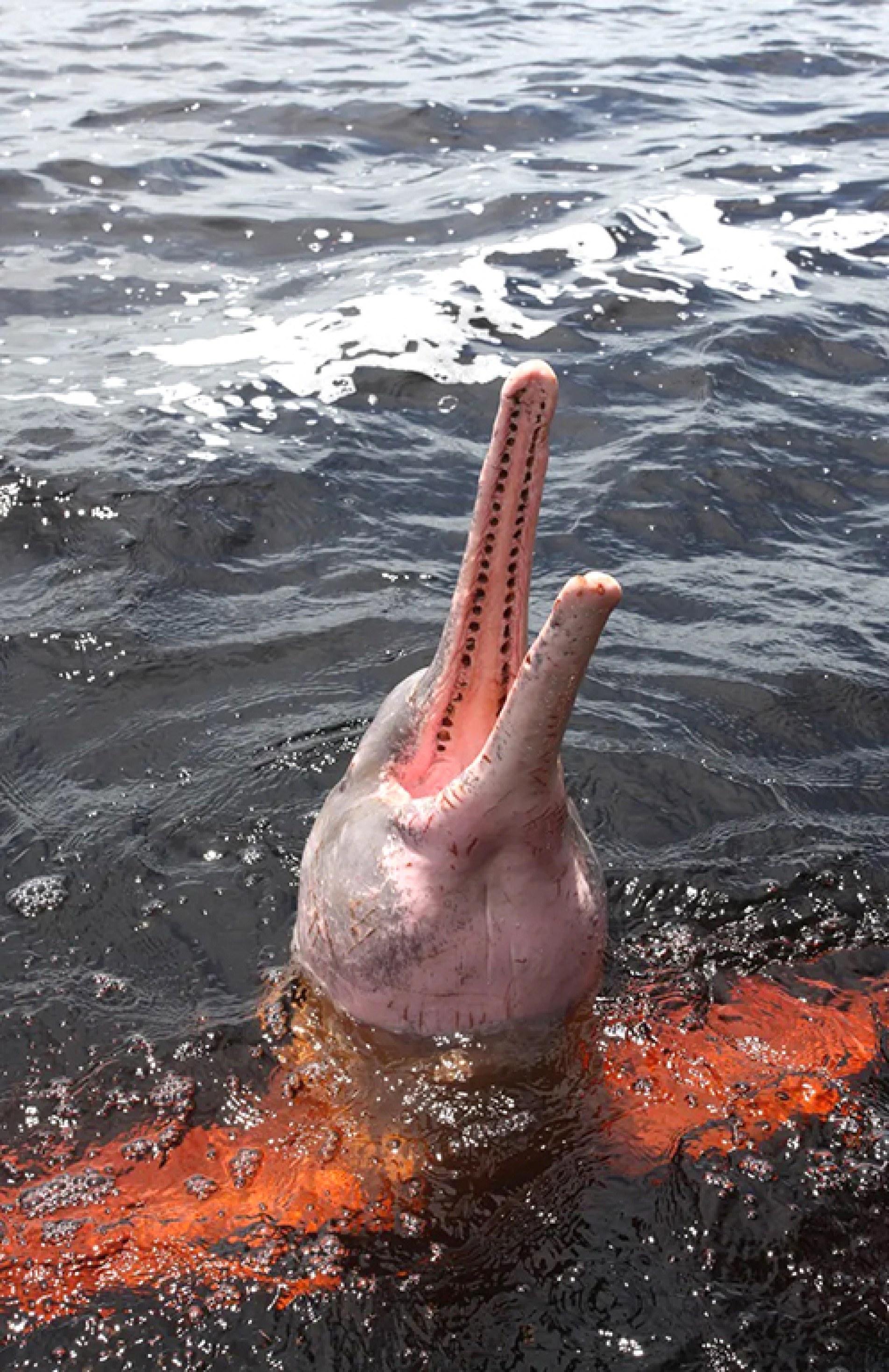 O boto-cor-de-rosa é o maior dos golfinhos fluviais, com os machos atingindo 2,55 metros de comprimento e 185 quilos, e as fêmeas chegam a 2,15 metros e 150 quilos. E o buraquinho na cabeça é por onde o boto respira.