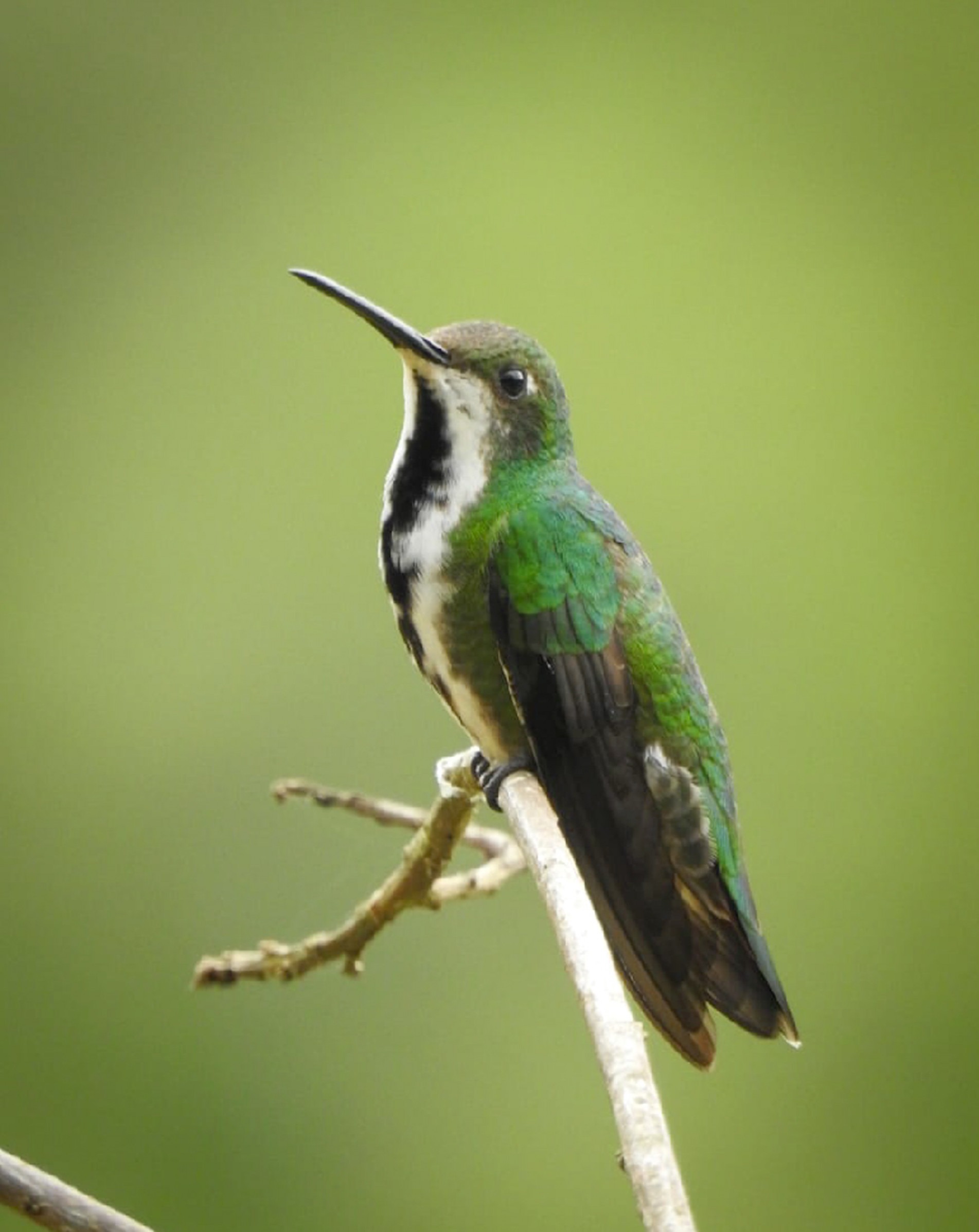 Observe a foto! O macho tem uma plumagem verde escura com peito e garganta preto-azulados, enquanto a fêmea tem uma faixa preta que vai do bico até a barriga, ladeada por faixas brancas largas. Ambos têm um bico longo e levemente curvado, ideal para se alimentar de néctar. Medem cerca de 10 centímetros de comprimento, bem pequenino não acha?