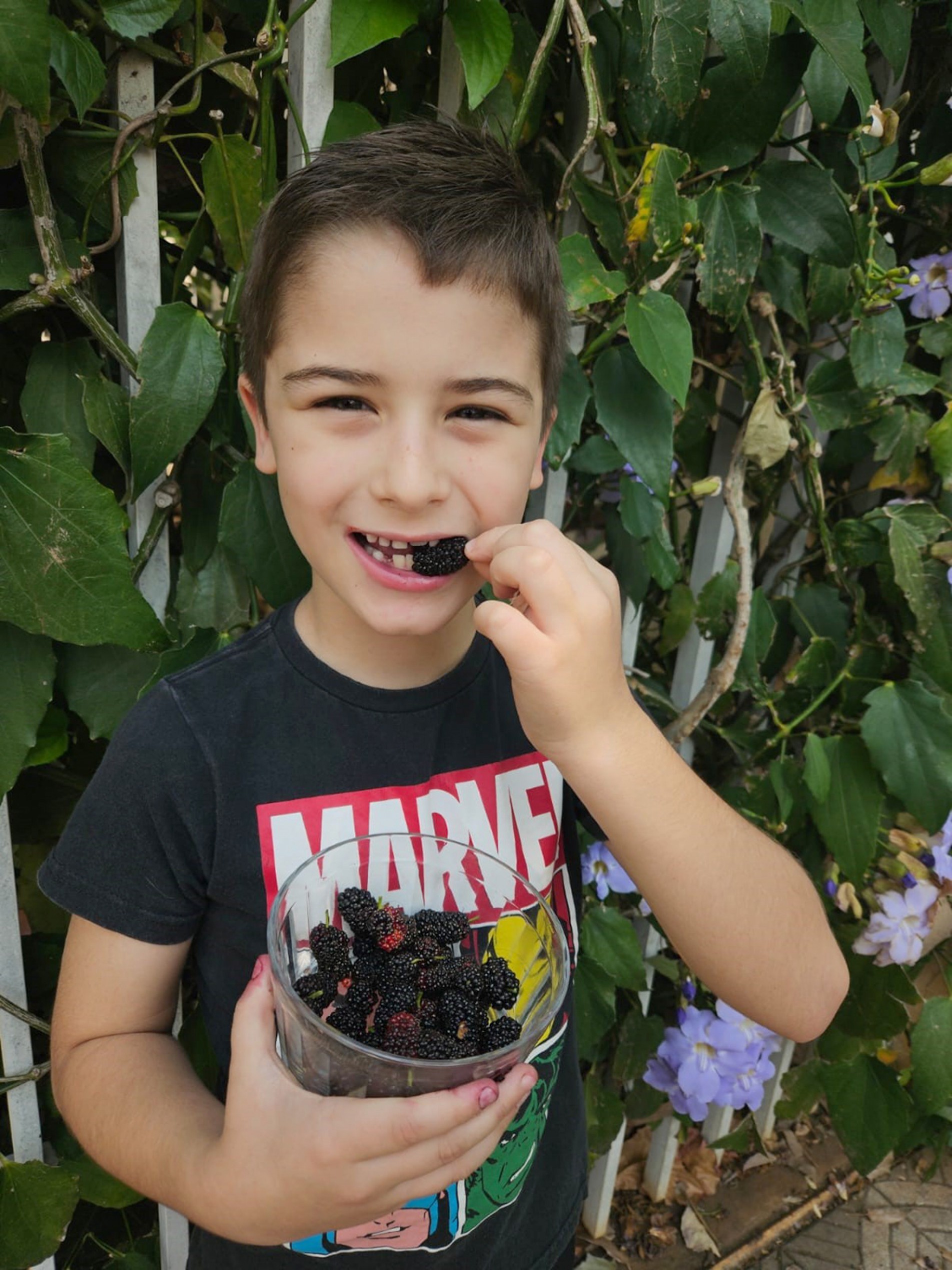 Miguel Cherione Silva de 7 anos adora morango, inclui em seu cardápio diário variações, gosta de experimentos, mas não é fã de mamão. Para ele, fruta é um alimento que não pode faltar na lancheira. “Essa semana me lambuzei com amora colhida na chácara da vovó, e adorei”, conta.