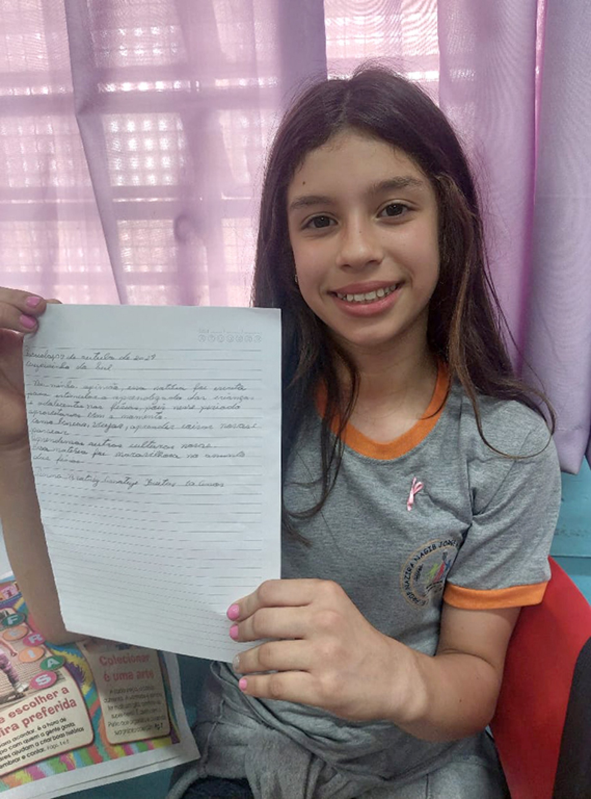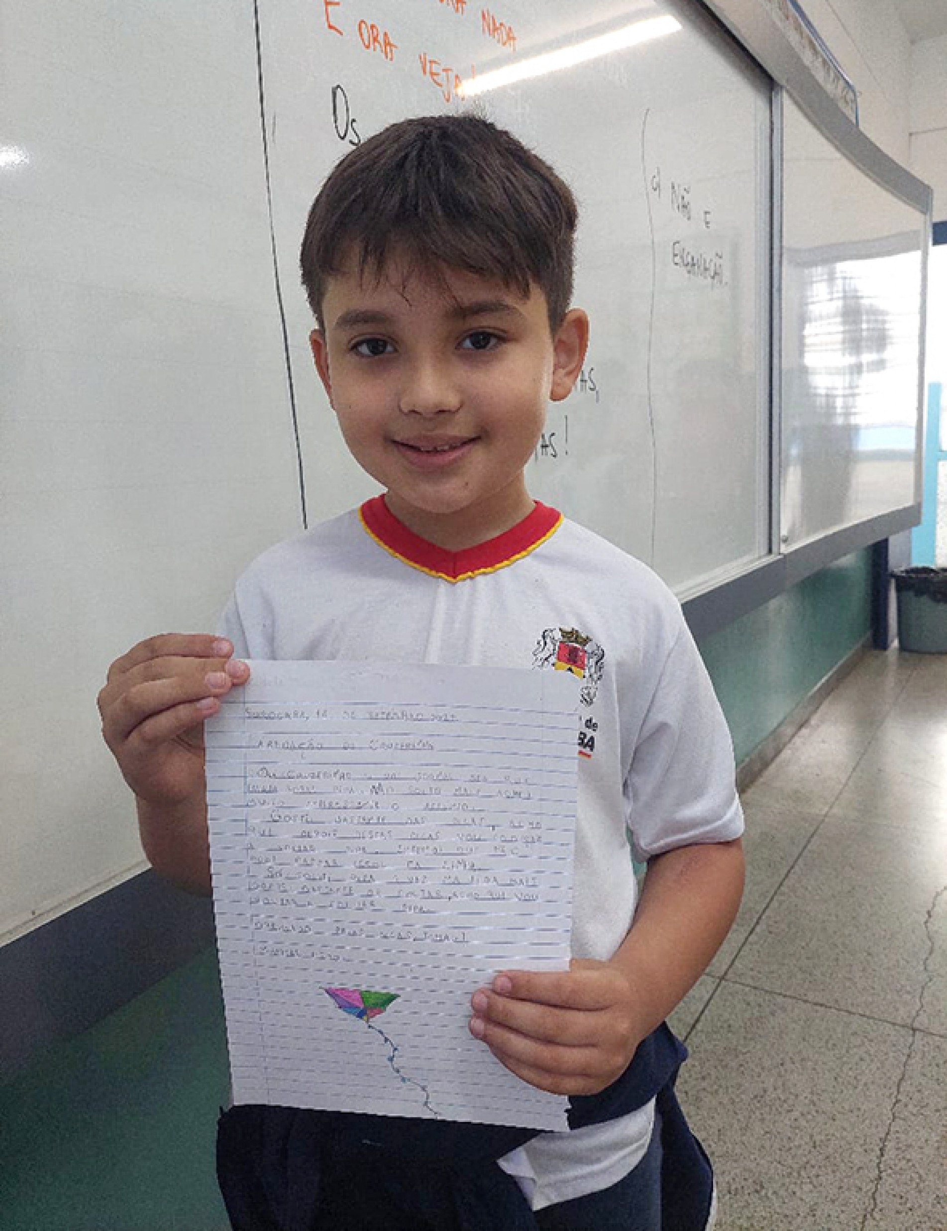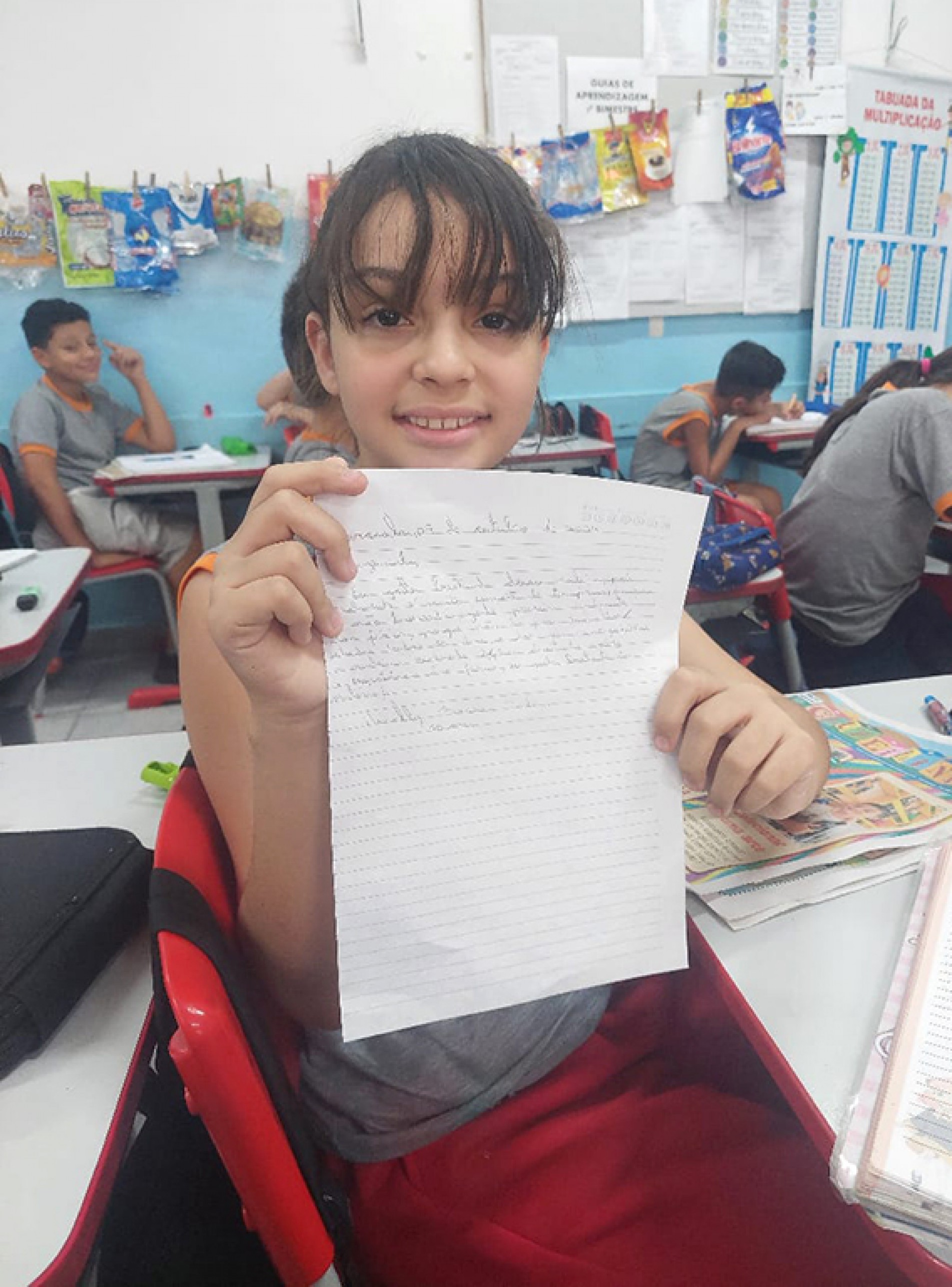 A Ariadna Albarracin Castro, de nove anos, quando soube que escreveria uma carta do leitor ficou animada, apesar de já ter o hábito dentro de casa. “Mas escrever para um jornal é diferente, né? Amei participar da atividade, apesar de ser um pouco estranho também”, observou a aluna do 3º ano C. Na cartinha da estudante, agradeceu pelas dicas do uso do cerol, afinal, foi um aprendizado novo.(T.M.)