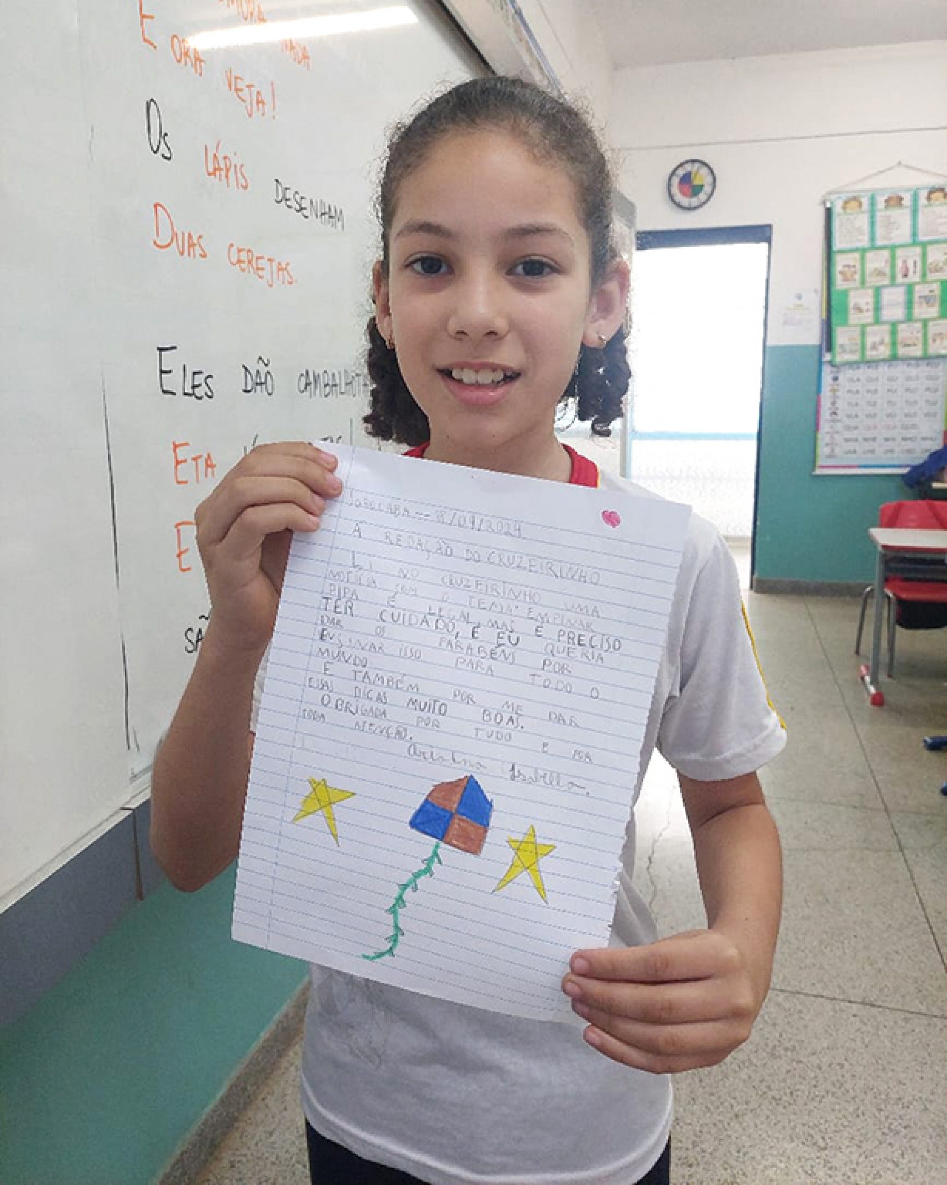 A responsável pela atividade foi a professora Hosana Guedes Bezerra. No planejamento de aula, o estudo de cartas e, justamente, na semana “do leitor”, a equipe recebeu o Cruzeirinho sobre os cuidados com a pipa. “Como aqui é um bairro onde as crianças brincam muito de pipa, caiu certinho e a turma se animou para ler, discutir sobre o tema e amaram”, explicou.