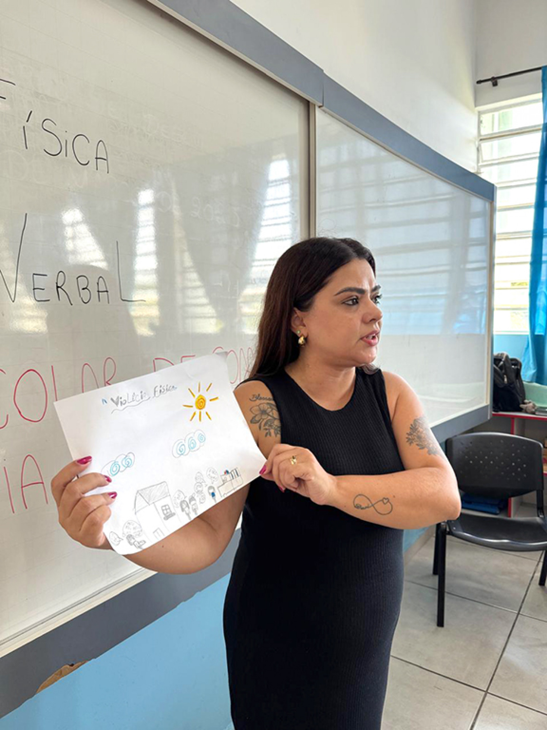 Os alunos receberam informações sobre o trabalho realizado pelo Cerem (Centro de Referência da Mulher), um importante serviço que oferece apoio jurídico, psicológico e social às mulheres vítimas de violência em Sorocaba. Também foi abordada a rede de apoio e assistência, que inclui canais de denúncia e serviços de proteção, como o Disque 180.