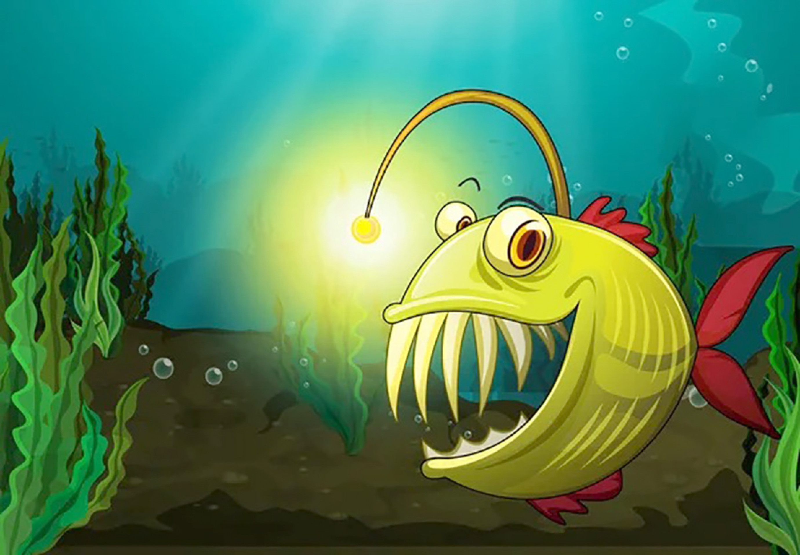 Um exemplo supercurioso é o peixe-pescador, aquele que aparece no filme “Procurando Nemo”, lembra? Ele tem uma luzinha na ponta da cabeça que funciona como isca para outros peixes. Quando alguém curioso se aproxima ele abre a boca!