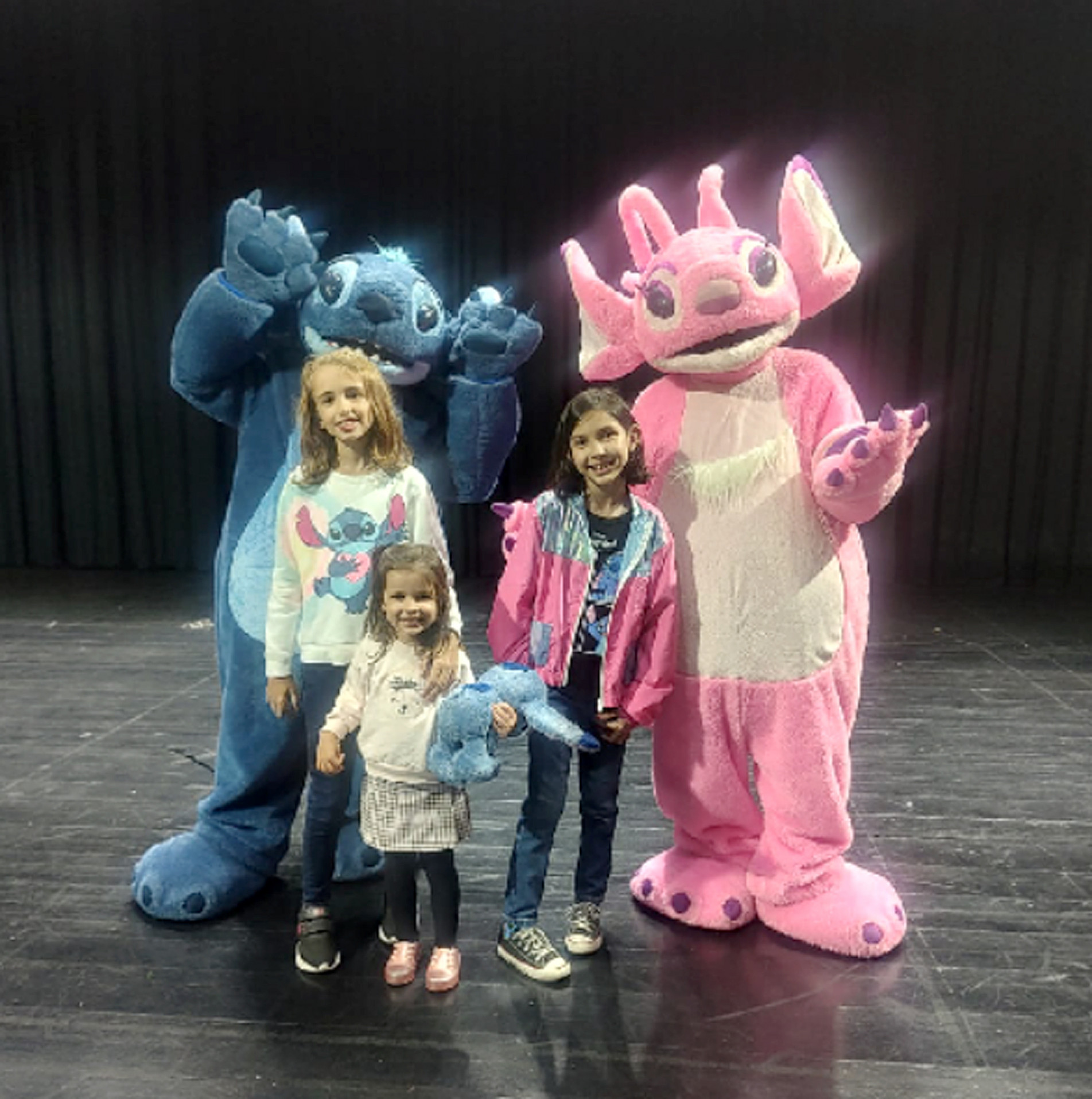 Maria Clara Bueno Yonamine Pacheco e as irmãs Lara e Letícia Bueno Bellentani também não esconderam o carinho. Para elas, Angel e Stitch transmitem amor e trazem conforto, tanto na hora de dormir quanto no palco, onde espalharam mensagens de carinho e amizade com um abraço cheio de afeto.