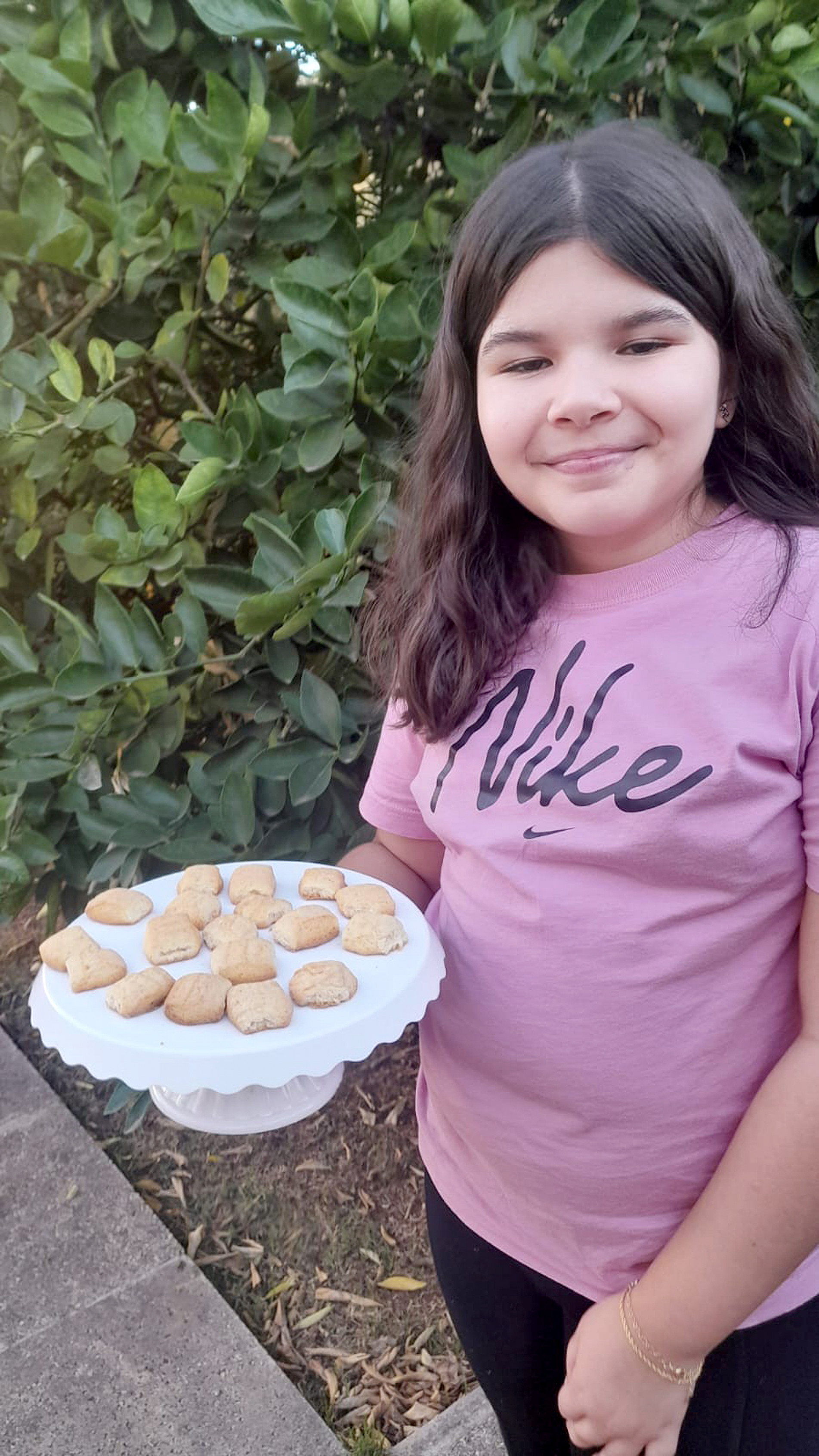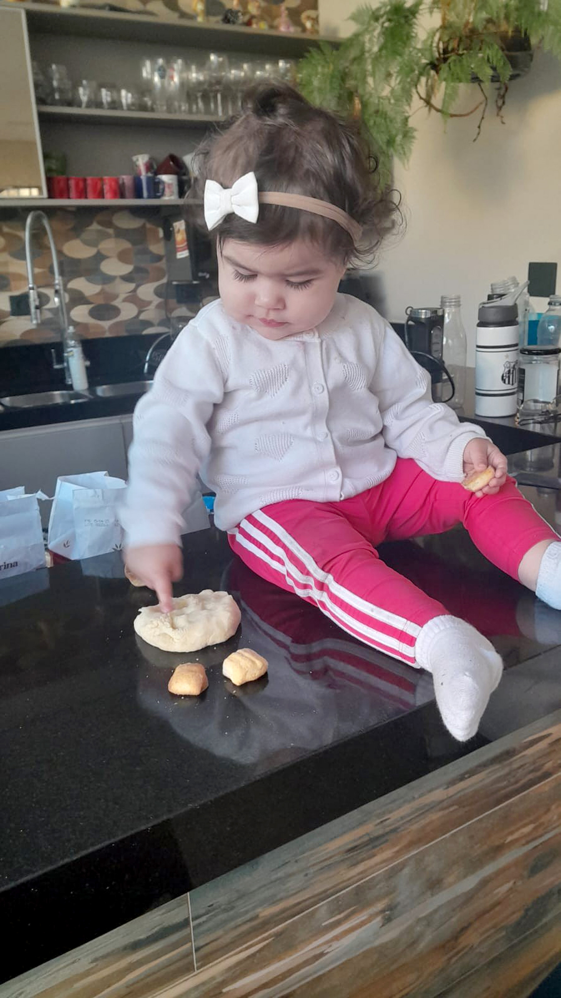 As primas Bianca de Oliveira Cunegatto, 9 anos, e Beatriz Estefani de Oliveira Vieira, de apenas 1 ano e 3 meses, também se divertiram na cozinha durante as férias. Para Bianca, participar da produção de uma receita da família foi mais do que cozinhar: “foi uma tarde de alegria, risadas, brincadeiras e guloseimas, momentos que vão ficar guardados no coração e na memória”. Já a pequena Beatriz, mesmo tão novinha, colocou a mão na massa, e se lambuzou ajudando a fazer as bolachas da tia da Bianca e da Beatriz, a tia Lú.