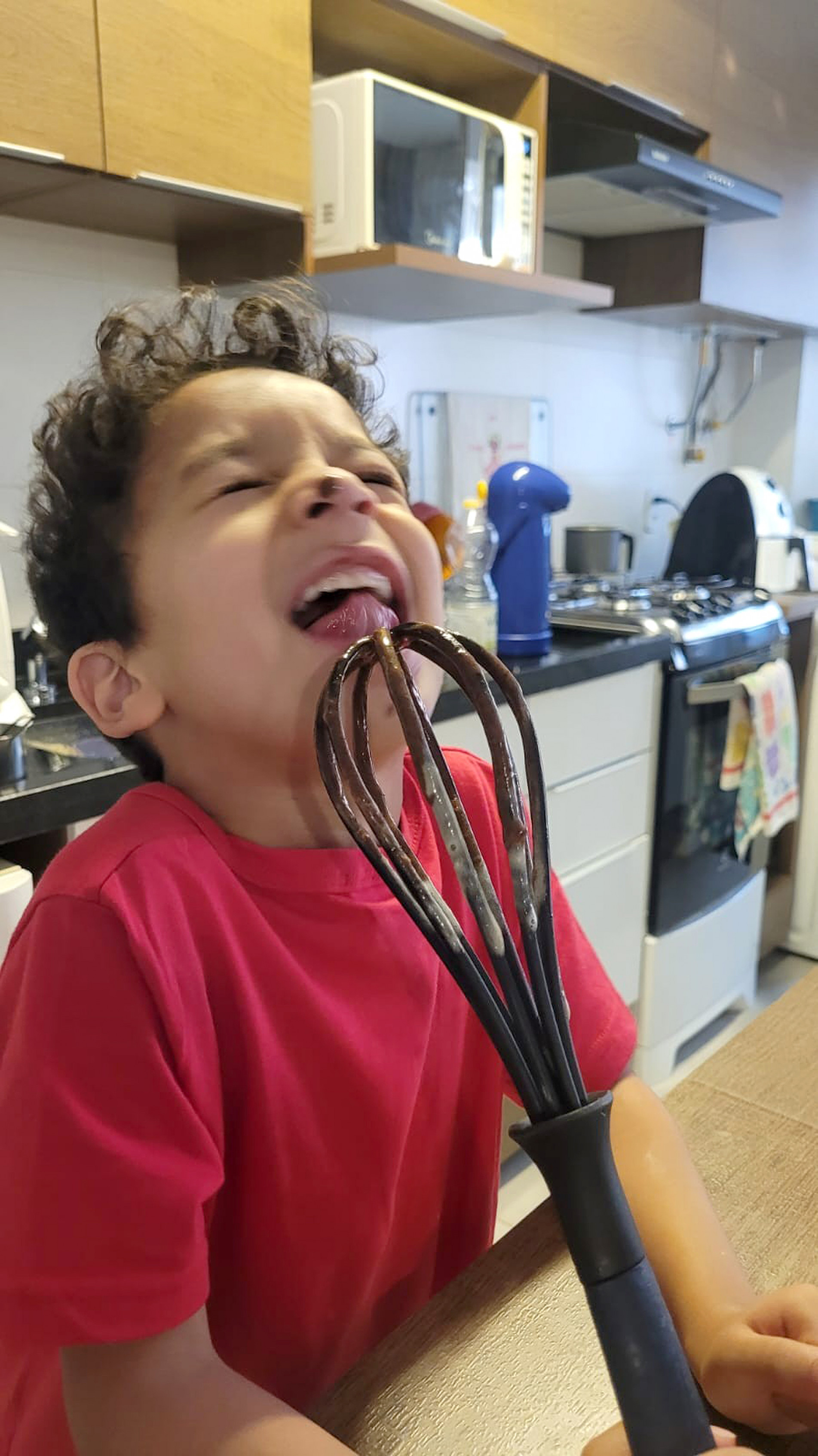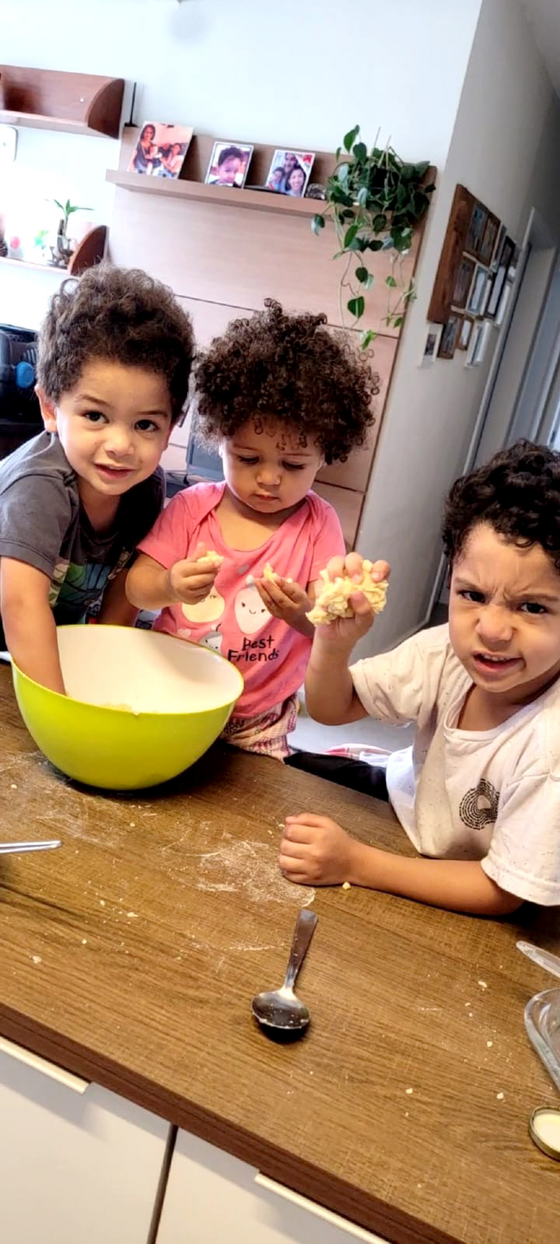 Mãe de Davi, 5 anos, João, 3, e Catarina, 2, ela diz que o trio se reveza na hora de quebrar os ovos e colocar os ingredientes no liquidificador. “Enquanto um segura a peneira, outro bate para a farinha passar. Na hora de misturar, tem fila e a vez de cada um. Mamãe coloca a massa na forma e chega o momento mais esperado: lamber a tigela e a espátula!”, diverte-se.