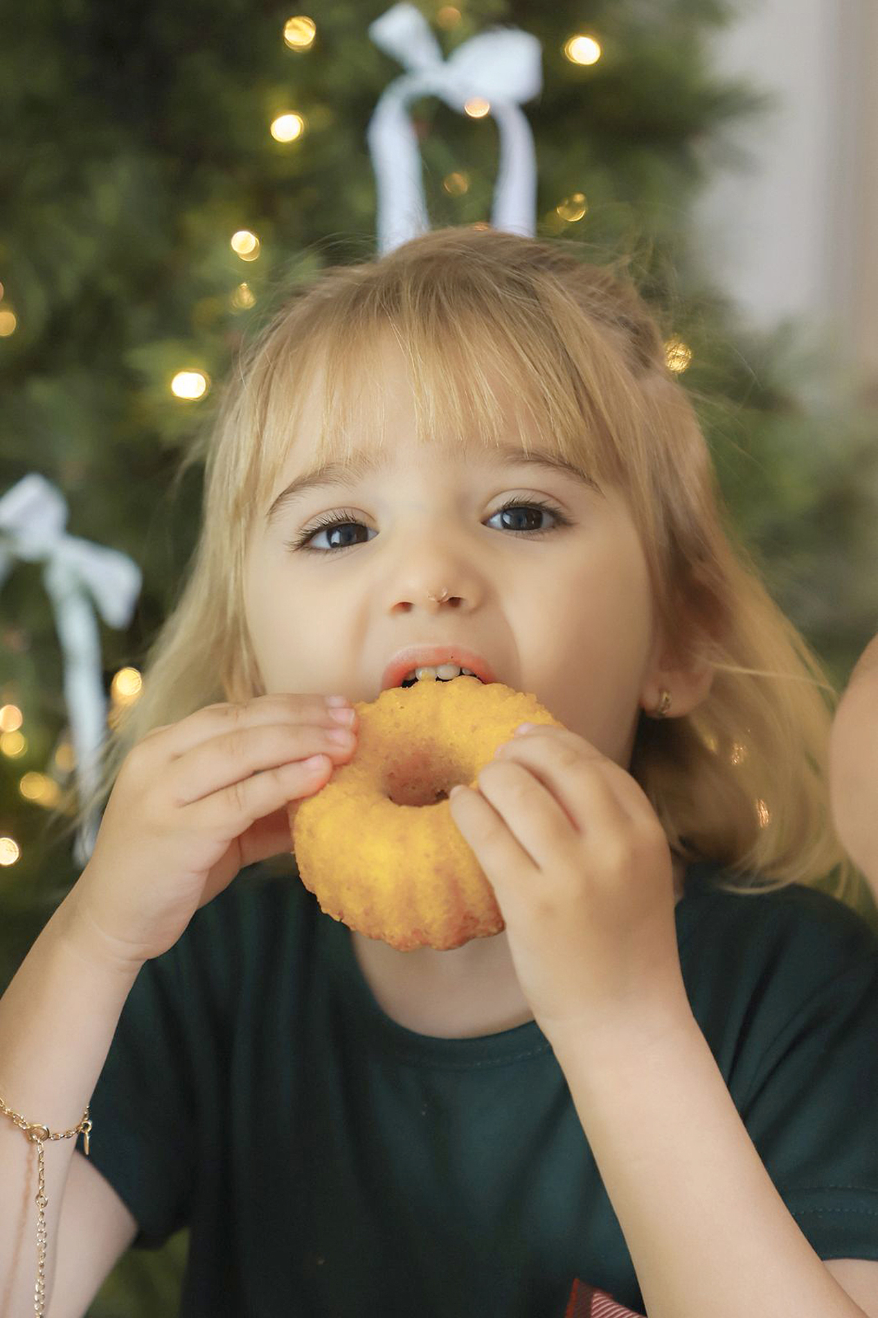 Os irmãos Júlia Bertin Franzini, de 2 anos, e Pedro Bertin Franzini, de 8 anos, acham que o Natal tem cheiro e sabor de doce. Filhos de uma mamãe confeiteira, eles adoram tudo o que é açucarado e delicioso. Pedro ama a banoffee da mamãe e sempre diz que é a melhor sobremesa do mundo. Já a pequena Júlia não resiste a bolos fofinhos e brigadeiros.
