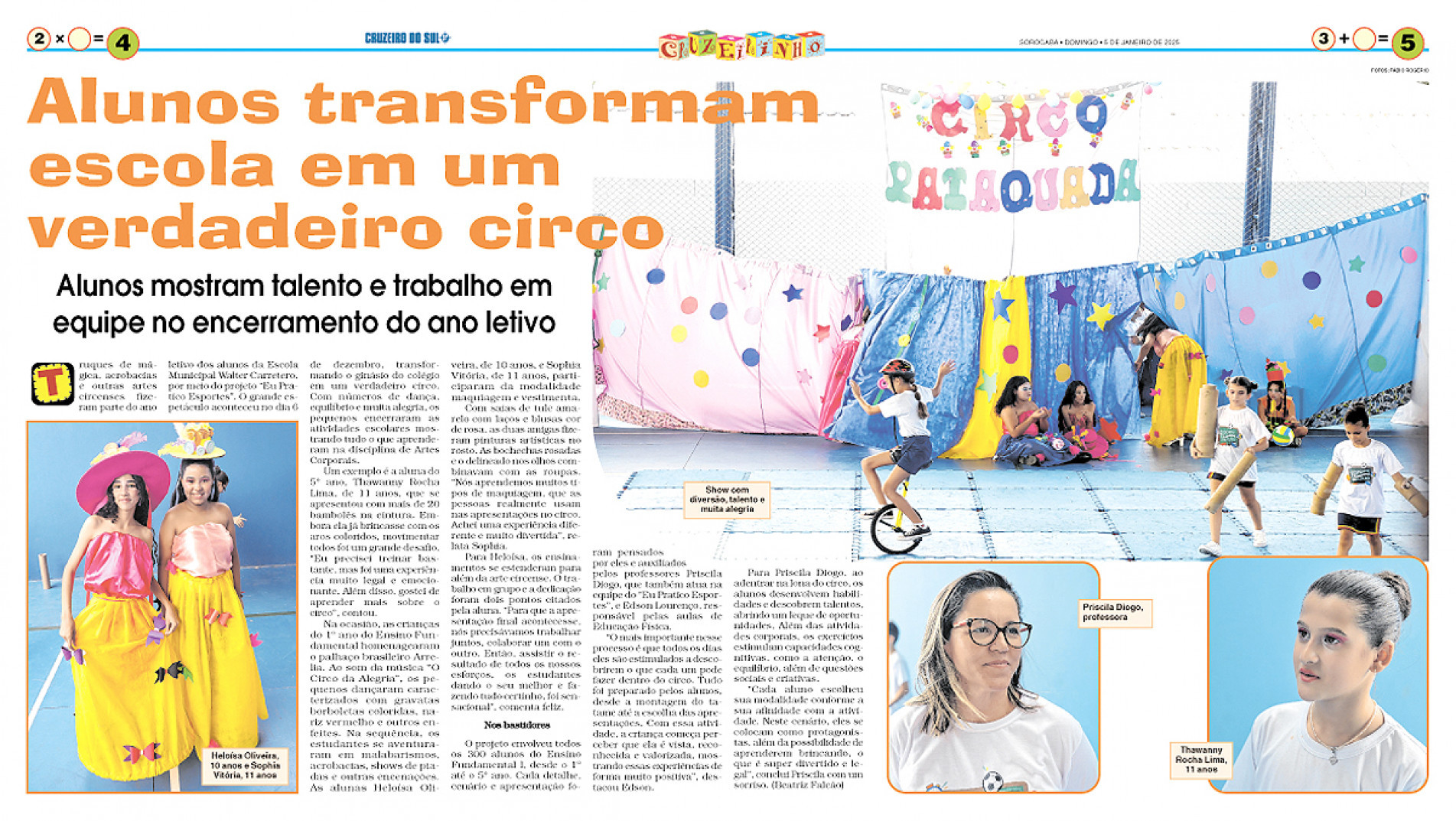 Logo no comecinho de 2025, na edição de 5 de janeiro, mostramos que a escola também pode virar palco. Alunos transformaram a Escola Municipal Walter Carretero, por meio do projeto “Eu Pratico Esportes”, em um verdadeiro circo, com dança, acrobacias e muitas risadas, provando que aprender em grupo pode ser um grande espetáculo.