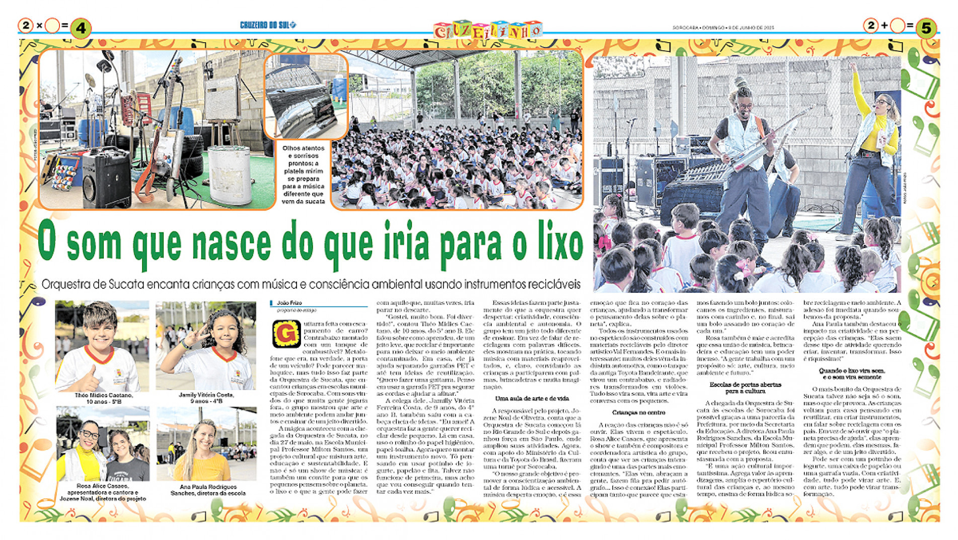 Em junho, na edição do dia 8, a música tomou conta do Cruzeirinho. Com instrumentos feitos de sucata, a Orquestra de Sucata se apresentou na Escola Municipal Professor Milton Santos e ensinou que é possível fazer som, arte e ainda cuidar do planeta.