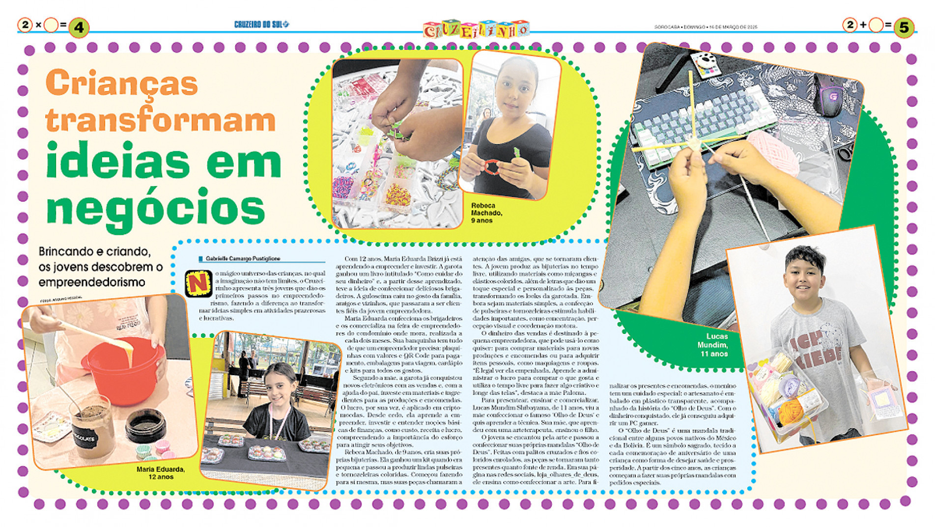 No mês de março, na edição do dia 16, conhecemos crianças cheias de ideias. Brigadeiros, pulseiras e artesanato mostraram que criatividade também pode virar aprendizado sobre dinheiro, organização e trabalho.
