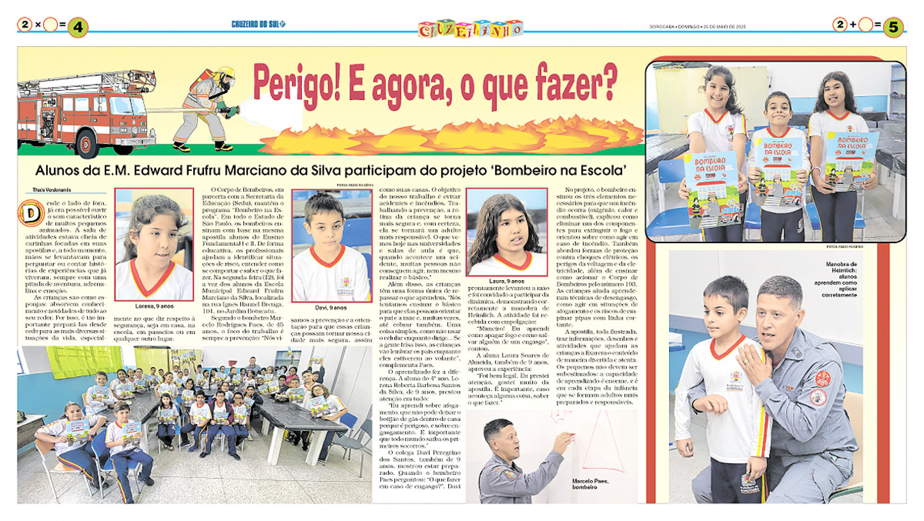 Já em maio, na edição do dia 25, falamos sobre um assunto muito importante. Com a ajuda dos bombeiros, as crianças da Escola Municipal Edward Frufru Marciano da Silva aprenderam como agir em situações de perigo e como cuidar da própria segurança.