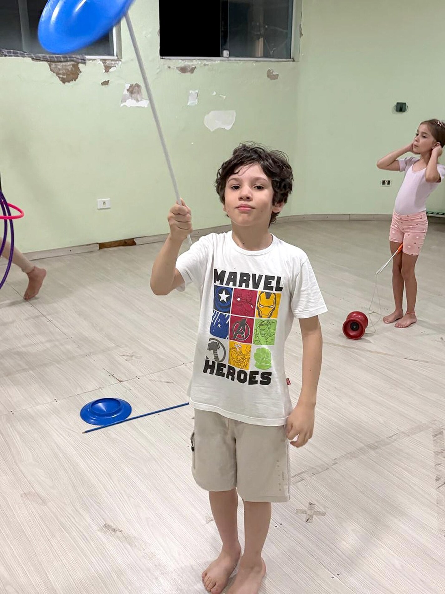 Nos aparelhos aéreos, os alunos utilizam equipamentos como tecidos, lira — que lembra um bambolê pendurado — e trapézio. Já nas atividades de malabares, as crianças trabalham com diferentes objetos e costumam escolher um deles para treinar durante um mês inteiro.
