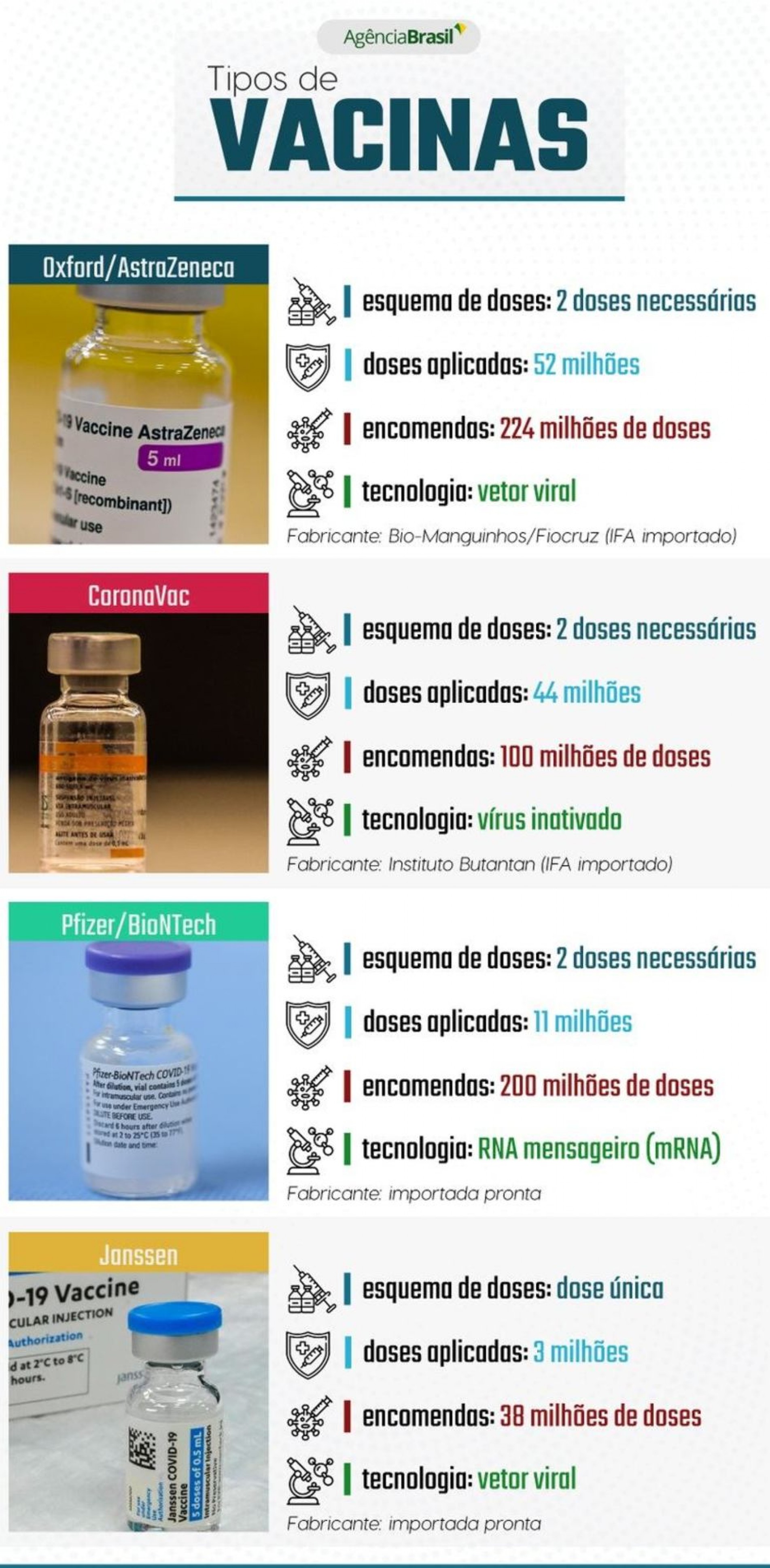 Com mais de 52 milhões de doses aplicadas, a Oxford/AstraZeneca era a vacina mais usada no País, segundo dados consultados em 15 de julho no vacinômetro do LocalizaSUS. Isso equivale a 46% das doses aplicadas. O Brasil contratou 100,4 milhões de doses dessa vacina por meio de um acordo de encomenda tecnológica assinado no ano passado com a farmacêutica europeia, montante que deve terminar de ser produzido em Bio-Manguinhos em agosto, a partir de ingrediente farmacêutico ativo (IFA) importado do laboratório chinês WuXi Biologics.