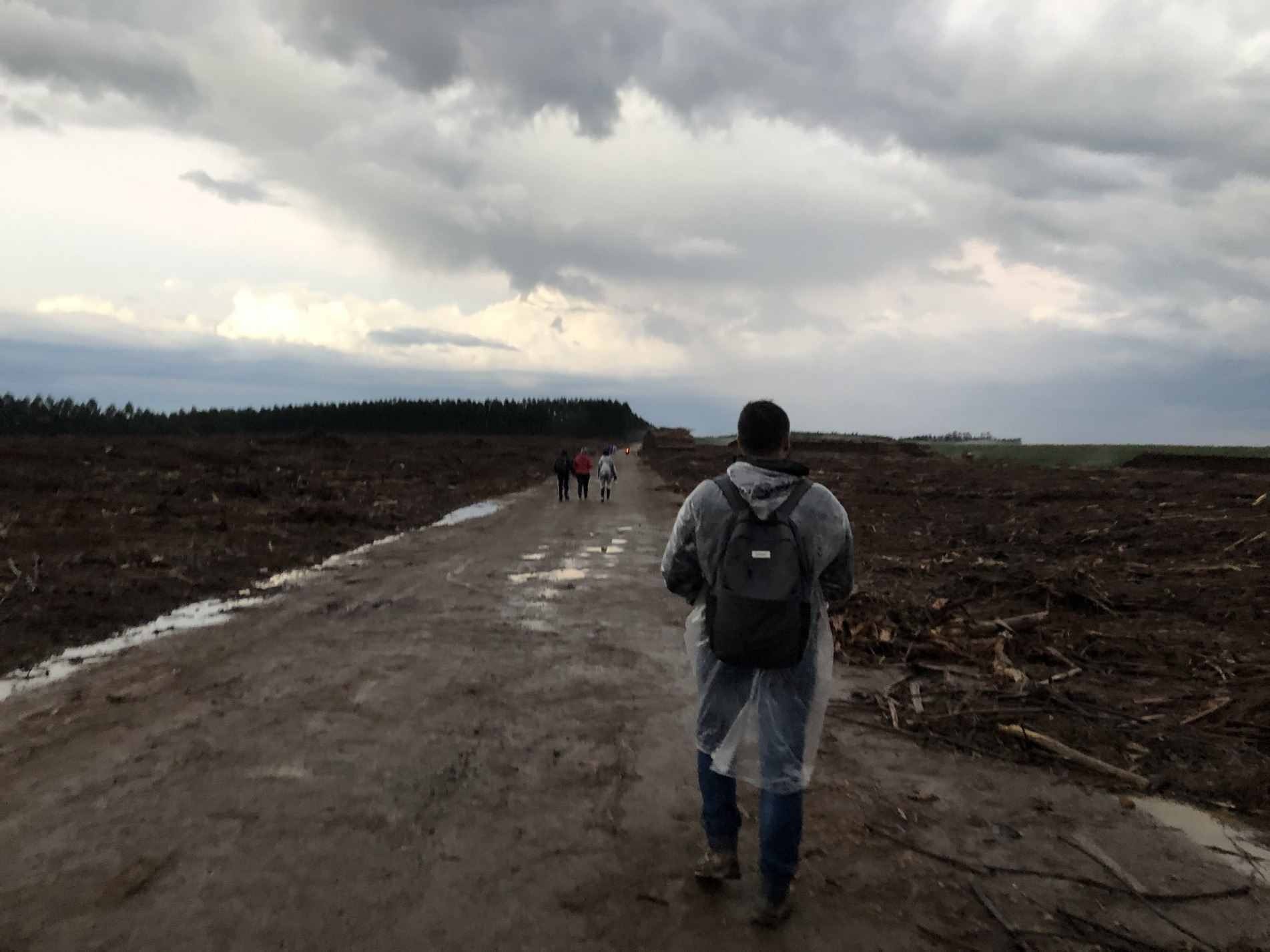 Um passo atrás do outro, quase que em fila indiana, o grupo seguia em uma mesma direção. Depois de passar por estrada de terra, atravessar a rodovia e andar um longo caminho beirando o asfalto, na escuridão da noite, uma plaquinha amarela marcava a distância percorrida. Em pouco mais de uma hora de caminhada, completamos cinco quilômetros. Faltavam apenas 21. Com os pés já doloridos, ver aquele número cinco desanimou. Por alguns segundos, cheguei a pensar em desistir, afinal, que loucura era essa que estava fazendo, debaixo da chuva, no meio do nada? Mas o momento de autosabotagem passou rapidamente, principalmente depois de ler a primeira mensagem bíblica do caminho. Comemorei por estar ali. Fiz mais uma oração. Respirei fundo. E segui, junto com o grupo.