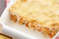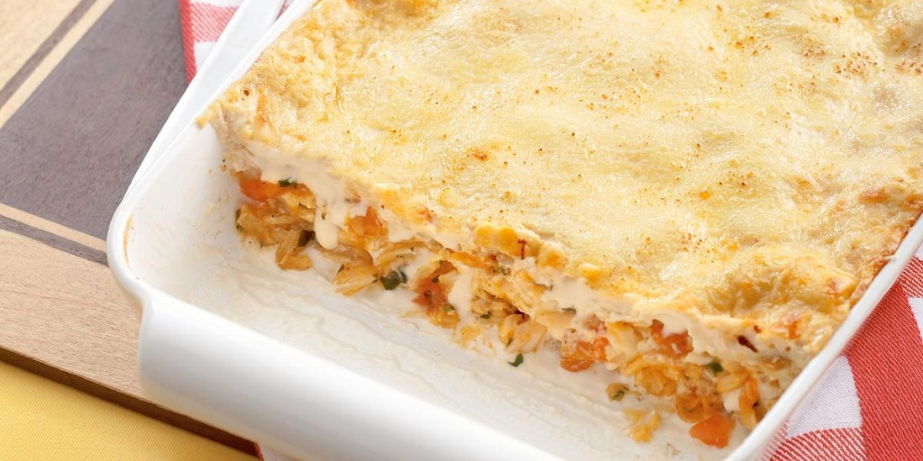 Em um recipiente refratário retangular grande (30 cm x 40 cm), faça uma camada da massa outra de molho, uma de recheio e uma de queijo muçarela.