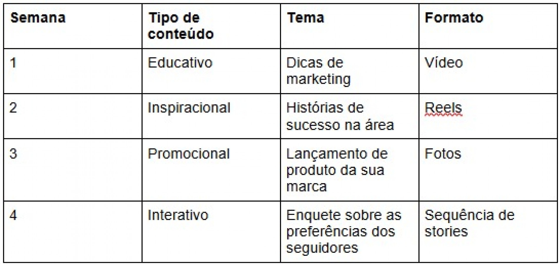 Ao fazer o planejamento para criar conteúdo para o Instagram, um calendário editorial pode ser uma ferramenta indispensável para organizar suas postagens e garantir consistência. Assim, planeje com antecedência os temas e formatos de cada postagem, levando em conta datas comemorativas e eventos relevantes para o seu nicho. Veja alguns exemplos: