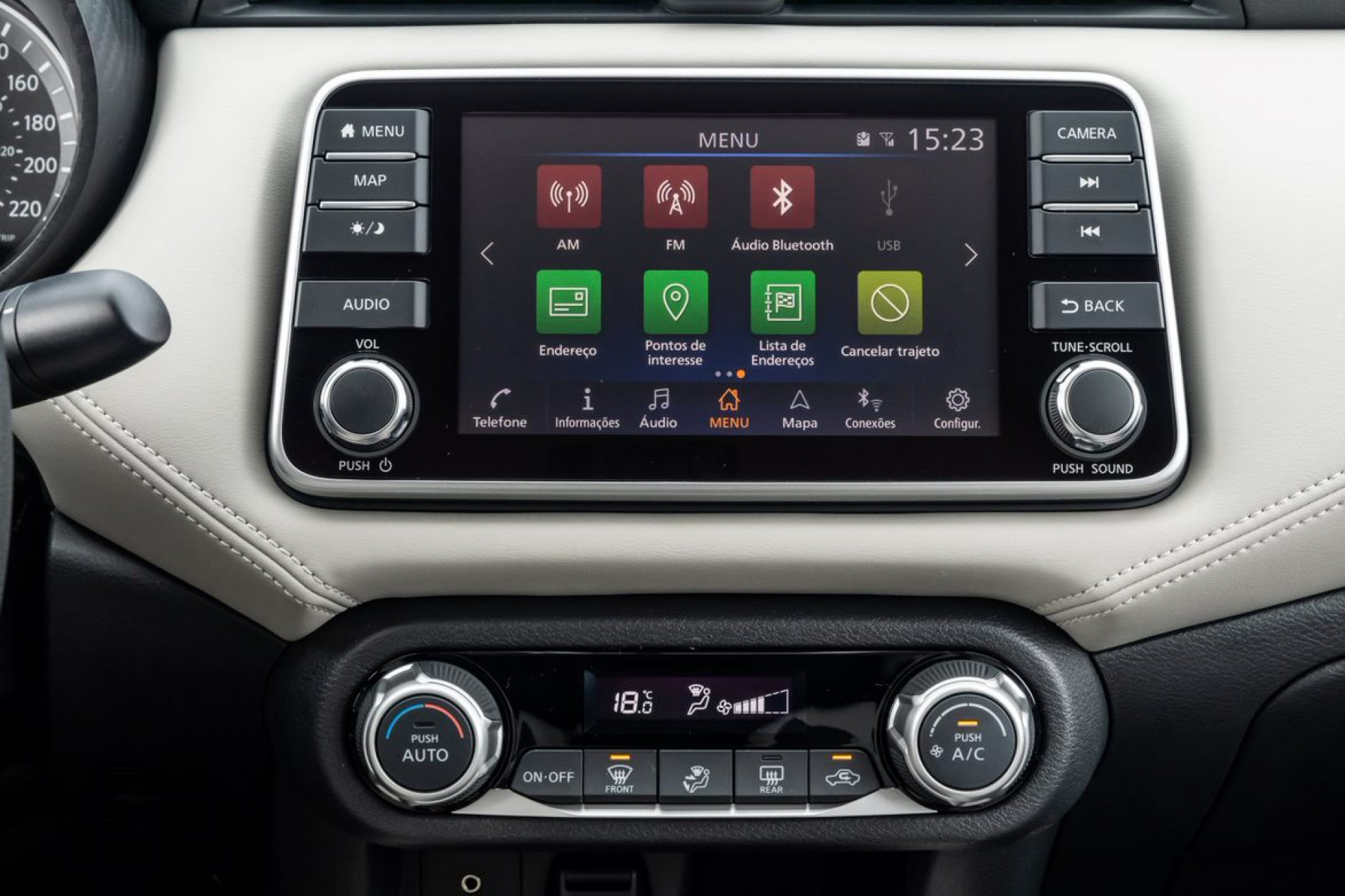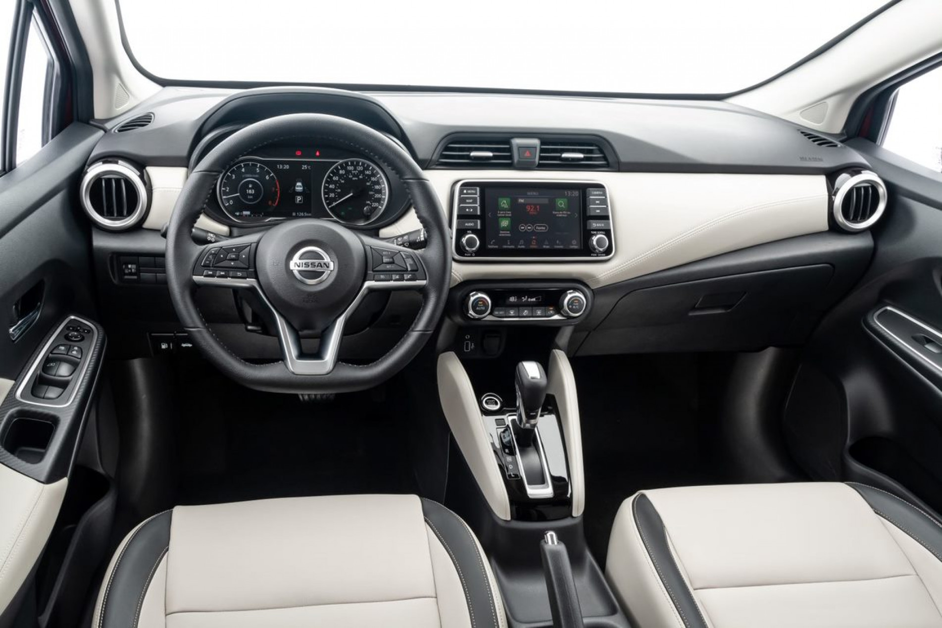 Já quem valoriza o que vai encontrar dentro do carro, pode ficar um pouco frustrado. O acabamento é bem feito, mas carrega bastante plástico, o que não transmite muito refinamento. Indo adiante e ficando mais íntimo carro, é difícil não lembrar do SUV Kicks ao observar o painel central e até mesmo o bom multimídia Nissan Connect com tela de 7”, que permite espelhamento de smartphones por cabo e tem GPS integrado, e ainda o conjunto de instrumentos parcialmente digital.