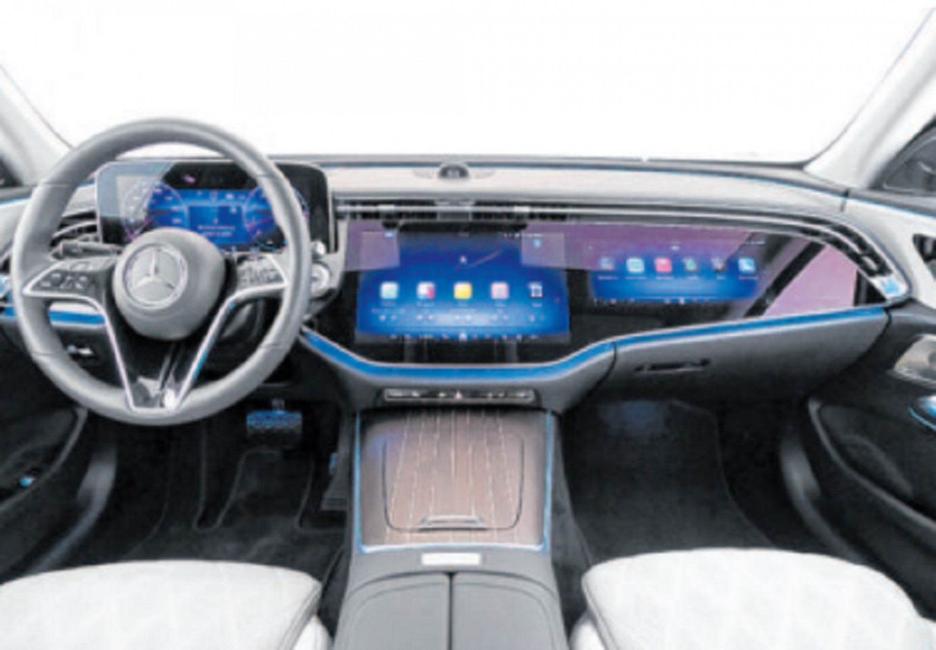 O primeiro olhar — é impossível evitar — vai para a grande superfície de vidro do conjunto MBUX Superscreen, formado por três telas digitais e que cria uma peça única no painel frontal.Aprimeira tela é do painel de instrumentos com efeito 3D com 12,3”.