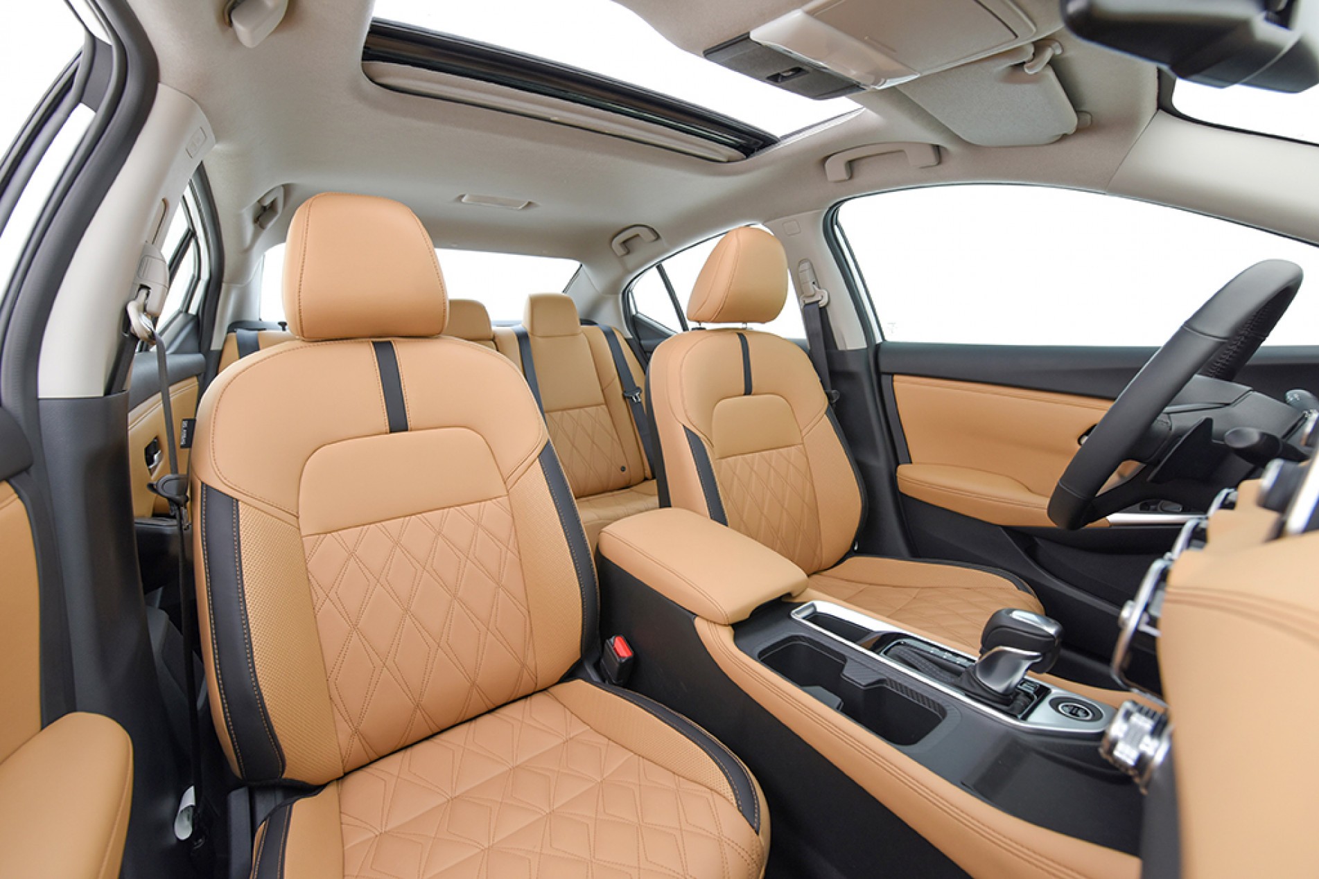 Do lado de dentro, sem alterações, ou seja, segue com boa dose de requinte com material emborrachado no painel, bancos e portas revestidos em couro na cor preta ou caramelo, ar-condicionado digital de duas zonas, multimídia com tela de 8 polegadas com Android Auto e Apple Carplay (mas ainda por cabo). Segue oferecendo o sistema de câmeras 360º da Nissan, que tem detector de objetos em movimento, mais teto solar com comando elétrico.