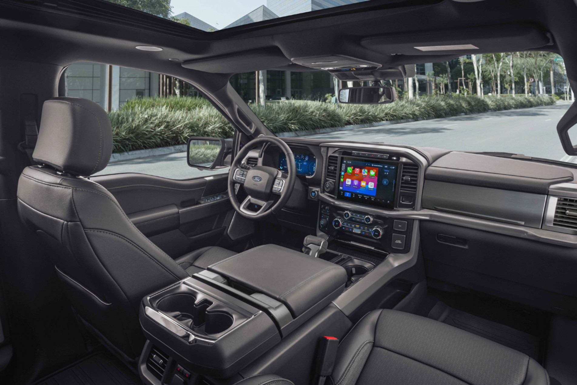 Dentro, o mesmo espaço digno de limosine, com direito a novas cores e materiais de acabamento. Tem grandes telas digitais de 12 polegadas para o painel de instrumentos e central multimídia, e é equipada com o “head-up display”, recurso que projeta informações do painel de instrumentos no para-brisa. Vale destaque ainda uma exclusividade bem interessante da F150, a iluminação externa 360 graus. O sistema conta com luzes que podem ser acionadas por zona, o que permite iluminar todo o entorno da picape. Um recurso bem-vindo em situações de parada na estrada e, mais ainda, para a rotina de trabalho numa fazenda, que é o melhor território dela.