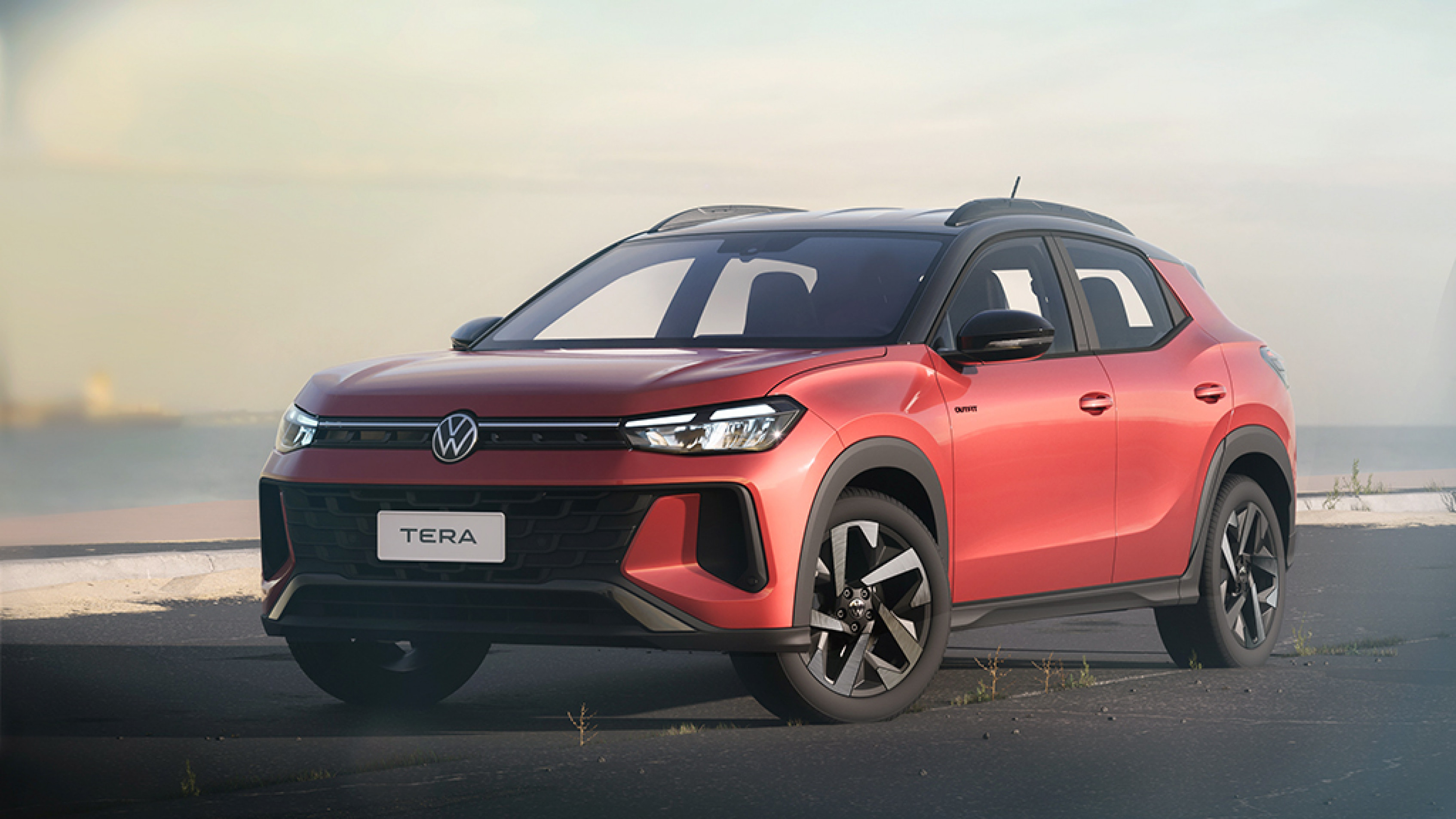 Nessa primeira aparição, foi apresentado nas cores vermelho hypernova, prata lunar e azul ártico, com rodas de liga leve aro 17 diamantadas, painel de instrumentos de 10”, multimídia VW Play Connect com carro conectado para Brasil e Argentina, carregamento de celular por indução, com entrada de ar com controle do fluxo. Na versão apresentada, High, que é a topo de linha, o acabamento segue o padrão conhecido dos SUVs da VW, mas, no Tera, os plásticos têm texturas trabalhadas, painel com partes macias ao toque, inclusive nos revestimentos das portas. Ou seja, apesar de se tratar do SUV mais barato da marca, daqui para a frente, traz mais cuidados em relação aos irmãos mais velhos. Em relação à segurança, conta com os recursos de assistência à condução do pacote ADAS. A motorização, também ainda não confirmada, deverá ser a mesma oferecida no Polo, o 1.0 aspirado de 84 cv, com câmbio manual de cinco marchas, e o 1.0 turbo de 116 cv com câmbio automático de seis marchas.