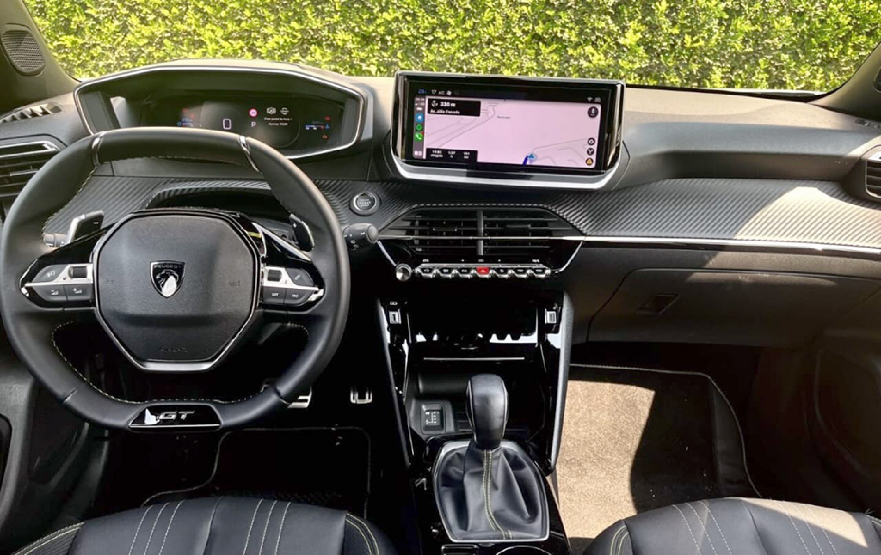 Segue com o conceito i-Cockpit da Peugeot, com volante pequeno, que deve ser posicionado abaixo do campo de visão do painel de instrumentos (configurável de 10”). Na versão GT, o conjunto de instrumentos é 3D com tecnologia holográfica, enquanto nas versões de baixo, o efeito é em 2D.