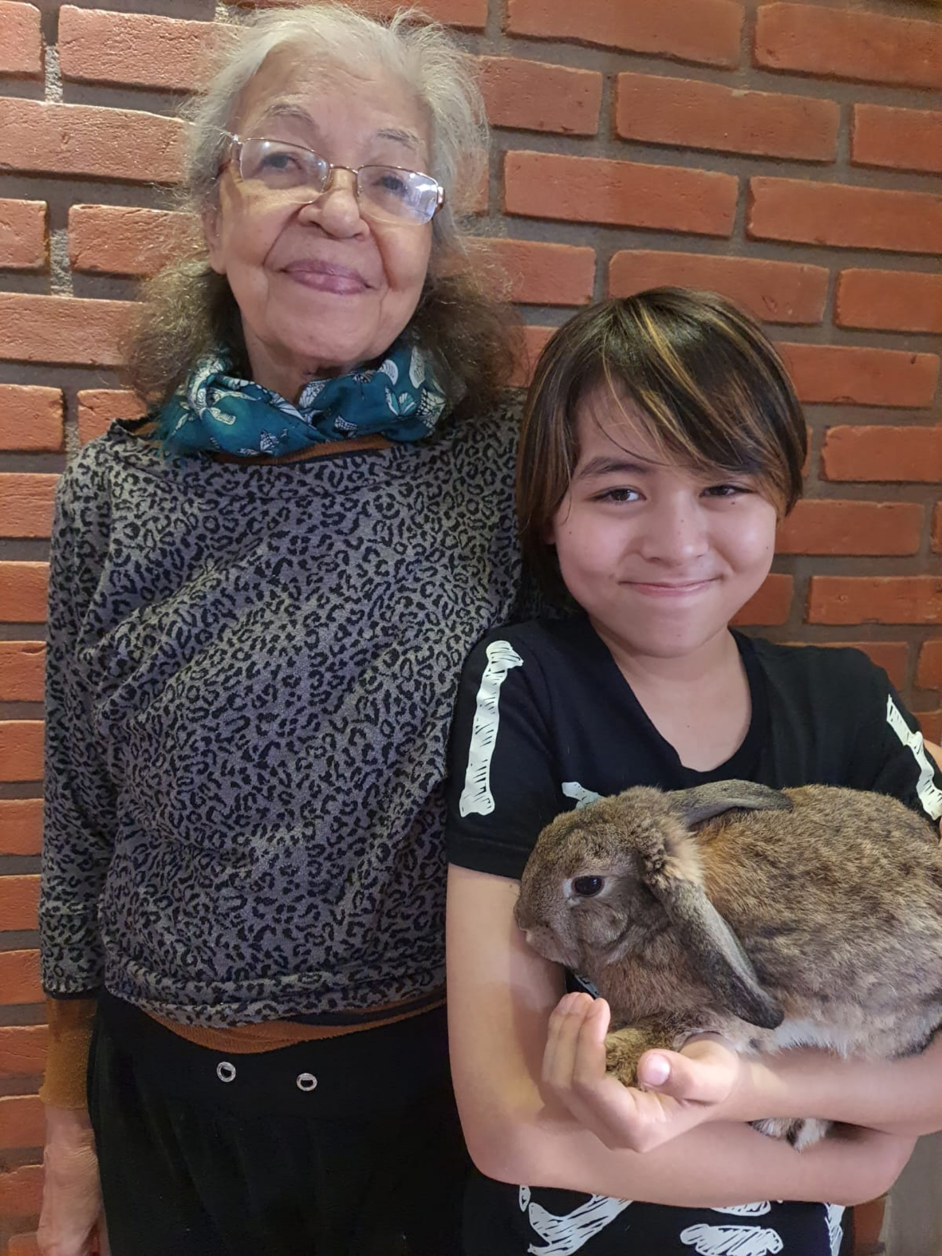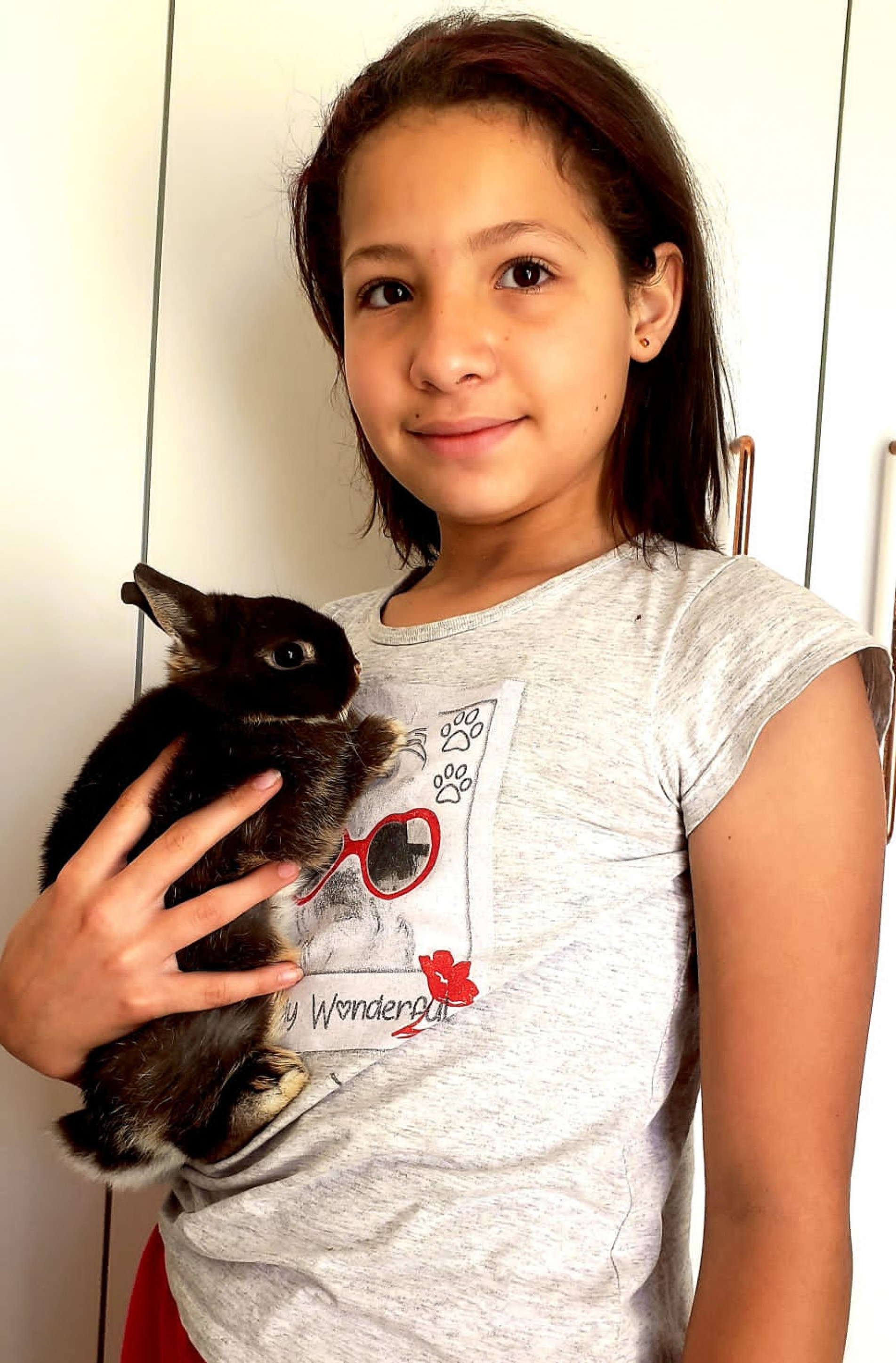 Tem também a Maya, que mora há sete meses com a Telma e a Raphaelly. Elas tem outros animais de estimação, mas sempre quiseram um coelhinho. Agora o sonho se realizou.