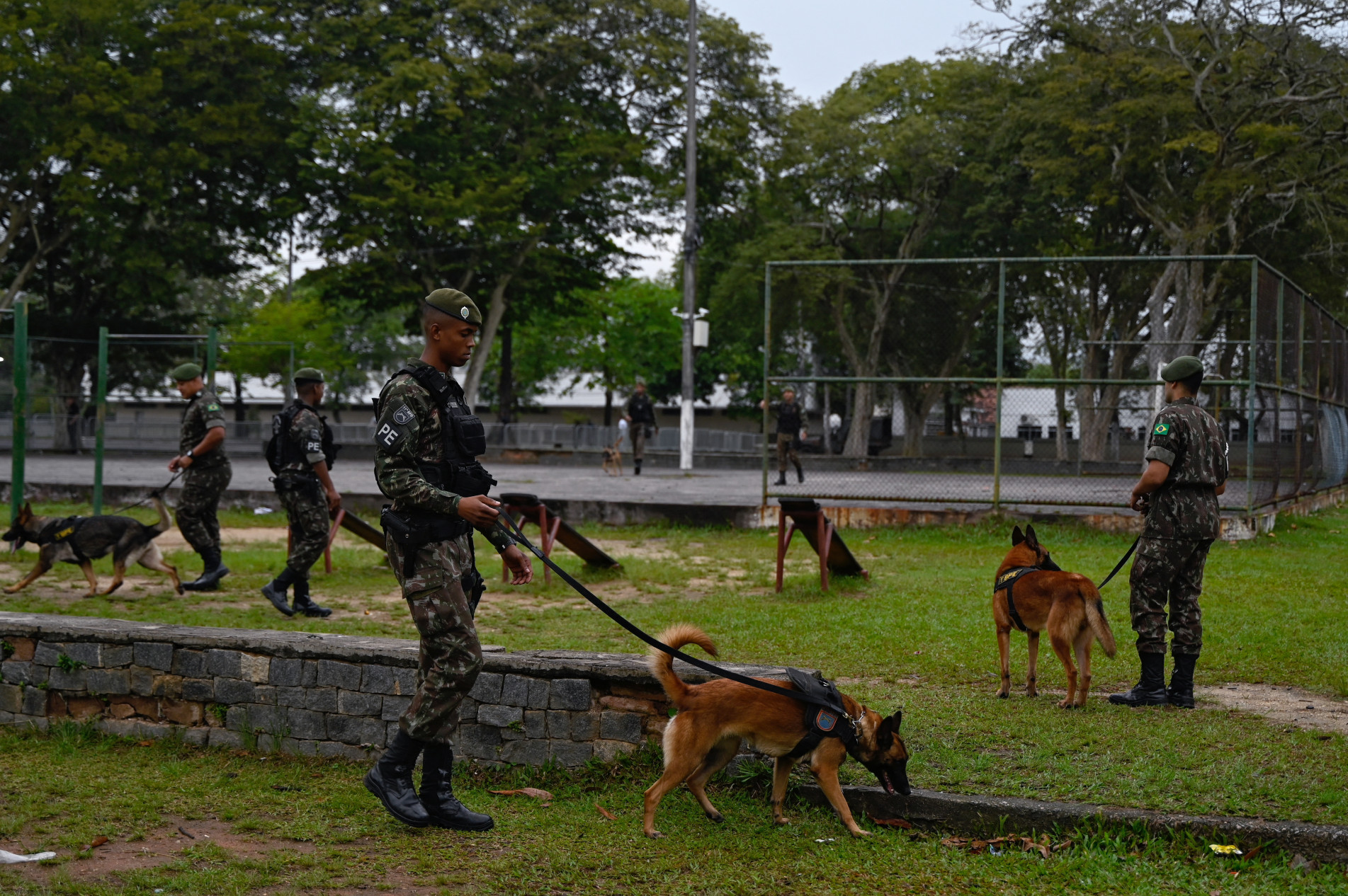 Quem teve uma missão de responsabilidade foi o pessoal do exército. Os cachorros, altamente treinados, inspecionaram o local de votação do presidente Jair Bolsonaro. A fiscalização é de praxe e feita antes da chegada do presidente. O trabalho dos cães é procurar explosivos e outras ameaças. Mas nada foi encontrado.