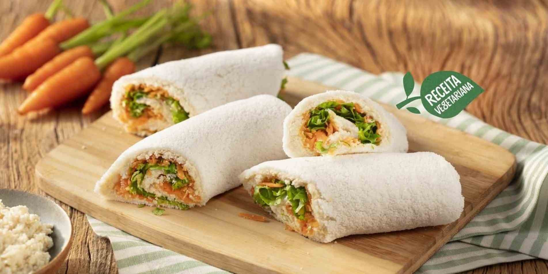 Montagem - Espalhe o patê sobre a tapioca e adicione a cenoura e a alface. Feche a tapioca no formato de rolinho e corte ao meio; - Sirva.
