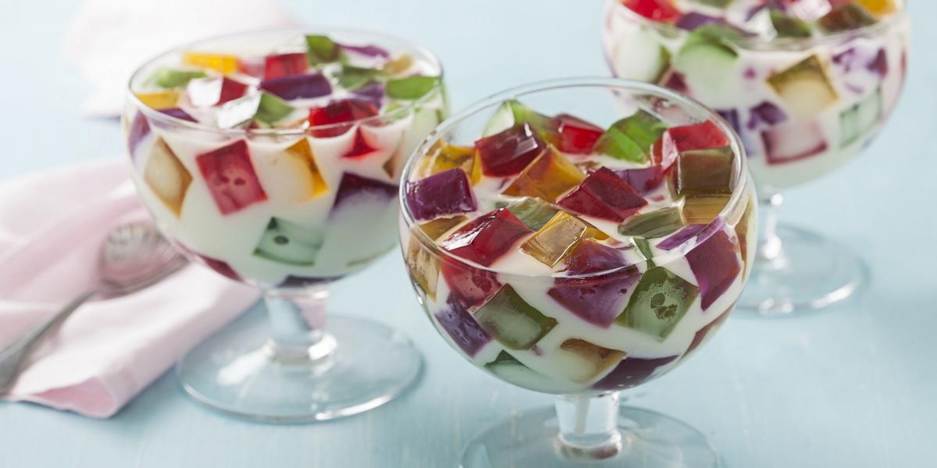 Coloque os cubos reservados de gelatina em taças, despeje sobre eles a mistura de leite condensado e leve à geladeira até ficar consistente.