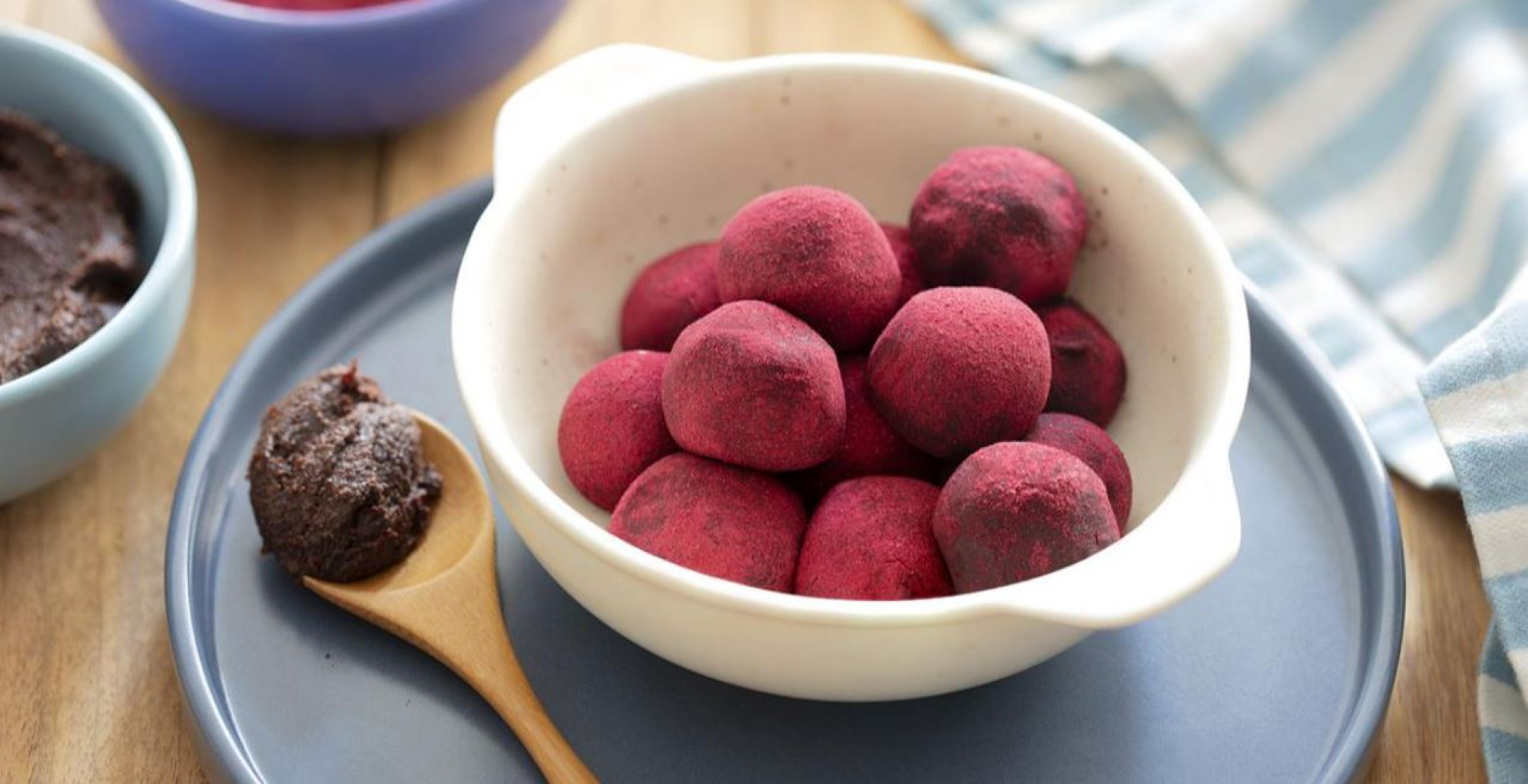 Quando a mistura esfriar, cubra a tigela com filme plástico e deixe na geladeira durante algumas horas até endurecer. Pegue porções pequenas com uma colher, enrole as bolinhas e passe-as na beterraba em pó para finalizar. Sirva.