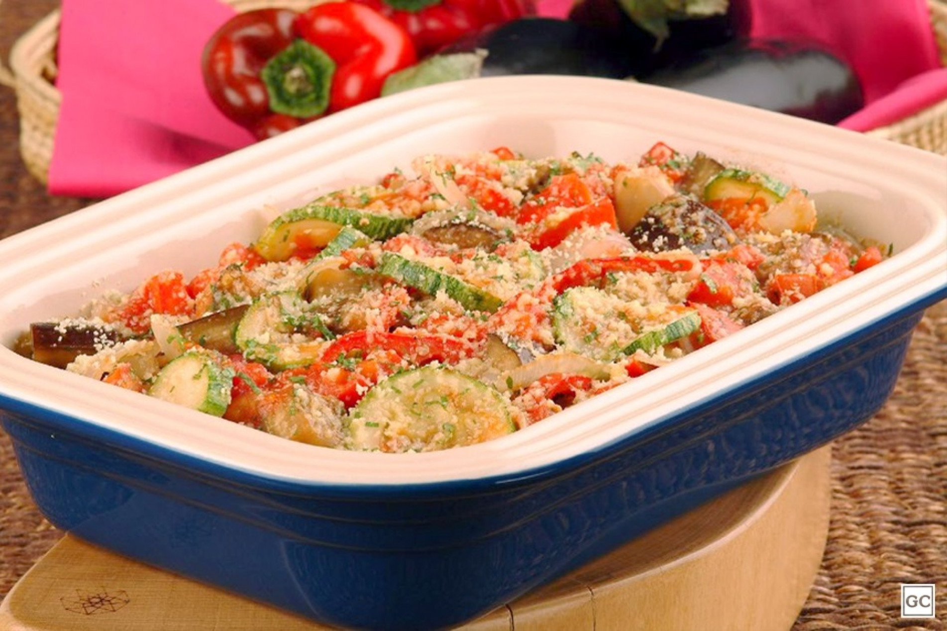 Comece pelo molho de vinagrete: coloque todos os ingredientes em uma tigela e misture bem. Em uma frigideira grande, aqueça o óleo, misture a berinjela, a cebola, o pimentão, a abobrinha e o molho vinagrete. Refogue os ingredientes em fogo médio-alto por 6 a 8 minutos ou até que os legumes estejam macios. Acrescente o molho de tomate e cozinhe por 15 minutos, mexendo de vez em quando. Coloque em um refratário untado e polvilhe com os queijos. Asse em forno médio, preaquecido por 15 minutos ou até que o queijo derreta. é fácil e serve oito porções.