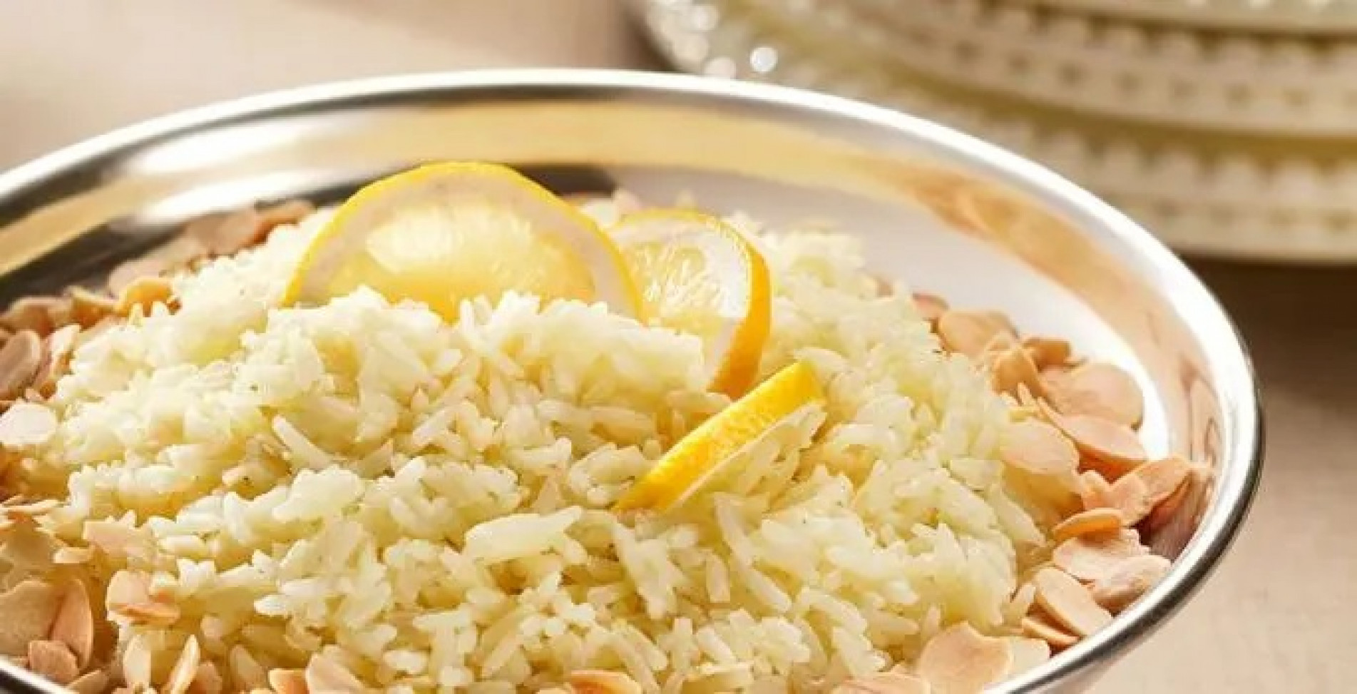 1 colher (sopa) de azeite 1 colher (sopa) de manteiga 1 dente de alho amassado 1 cebola pequena picada 2 xícaras (chá) de arroz lavado e escorrido 4 xícaras (chá) de água fervente meia xícara (chá) de amêndoas trituradas 1 tablete de caldo de legumes raspas da casca de 1 limão-siciliano suco de 1 limão-siciliano amêndoas em laminas, tostadas, para decorar rodelas de limão-siciliano