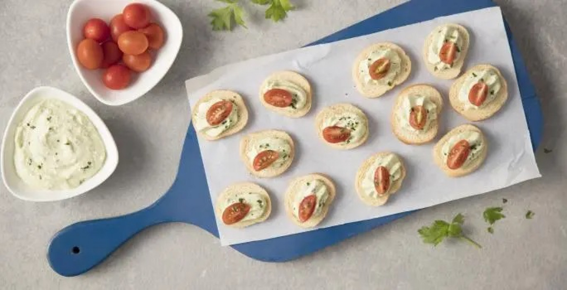 Coloque uma porção do creme nas torradinhas, um tomate-cereja e decore com a salsa. Sirva.