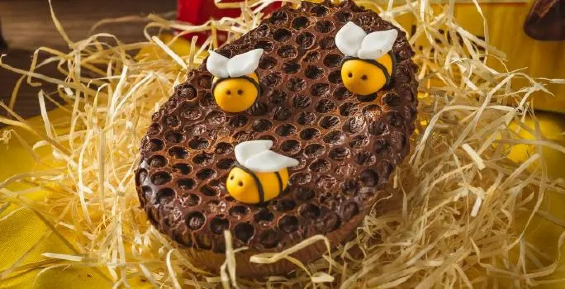 Cubra o ovo com o chocolate temperado e, com ele ainda mole, encoste um plástico-bolha na superfície e espere até que o chocolate endureça. Retire o plástico com cuidado para ter o acabamento como o de um favo de mel. Sirva.