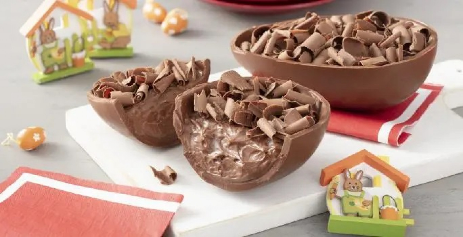 Desenforme as cascas. Recheie as duas partes dos ovos e leve geladeira por 1 hora. Sirva decorada com as raspas de Chocolate.