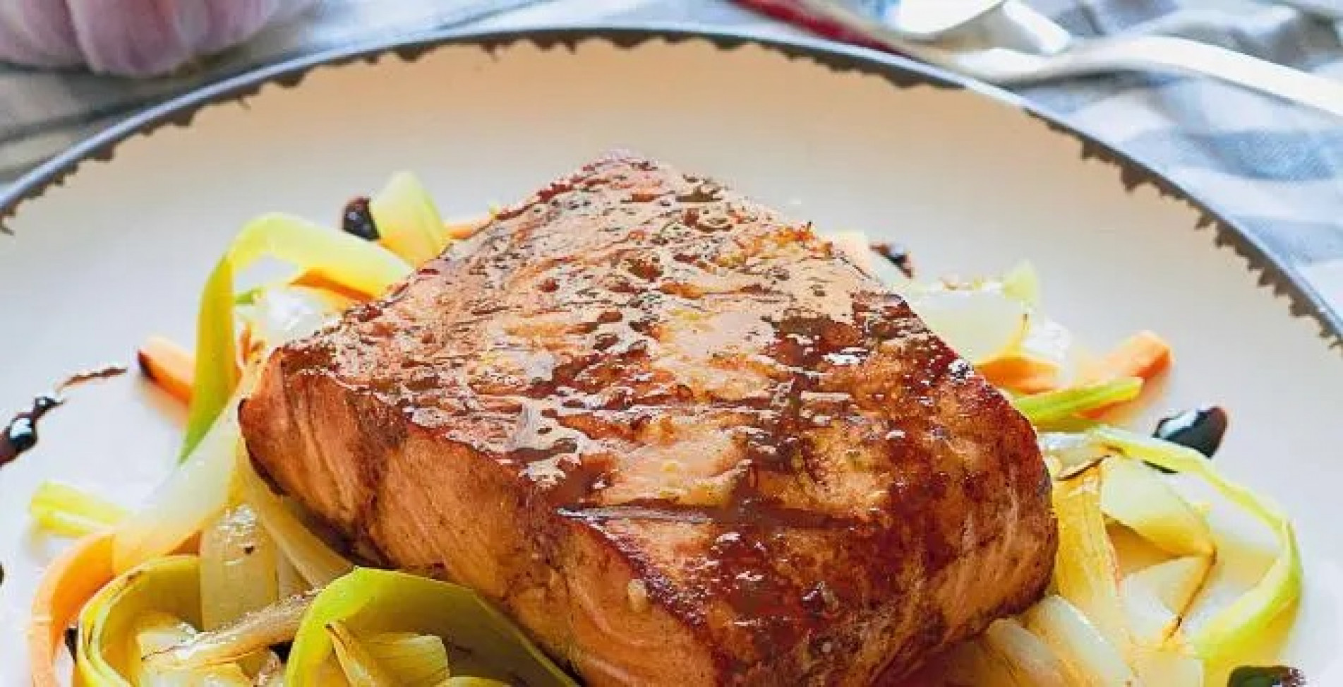 Salmão em cama de legumes e caramelo de gengibre