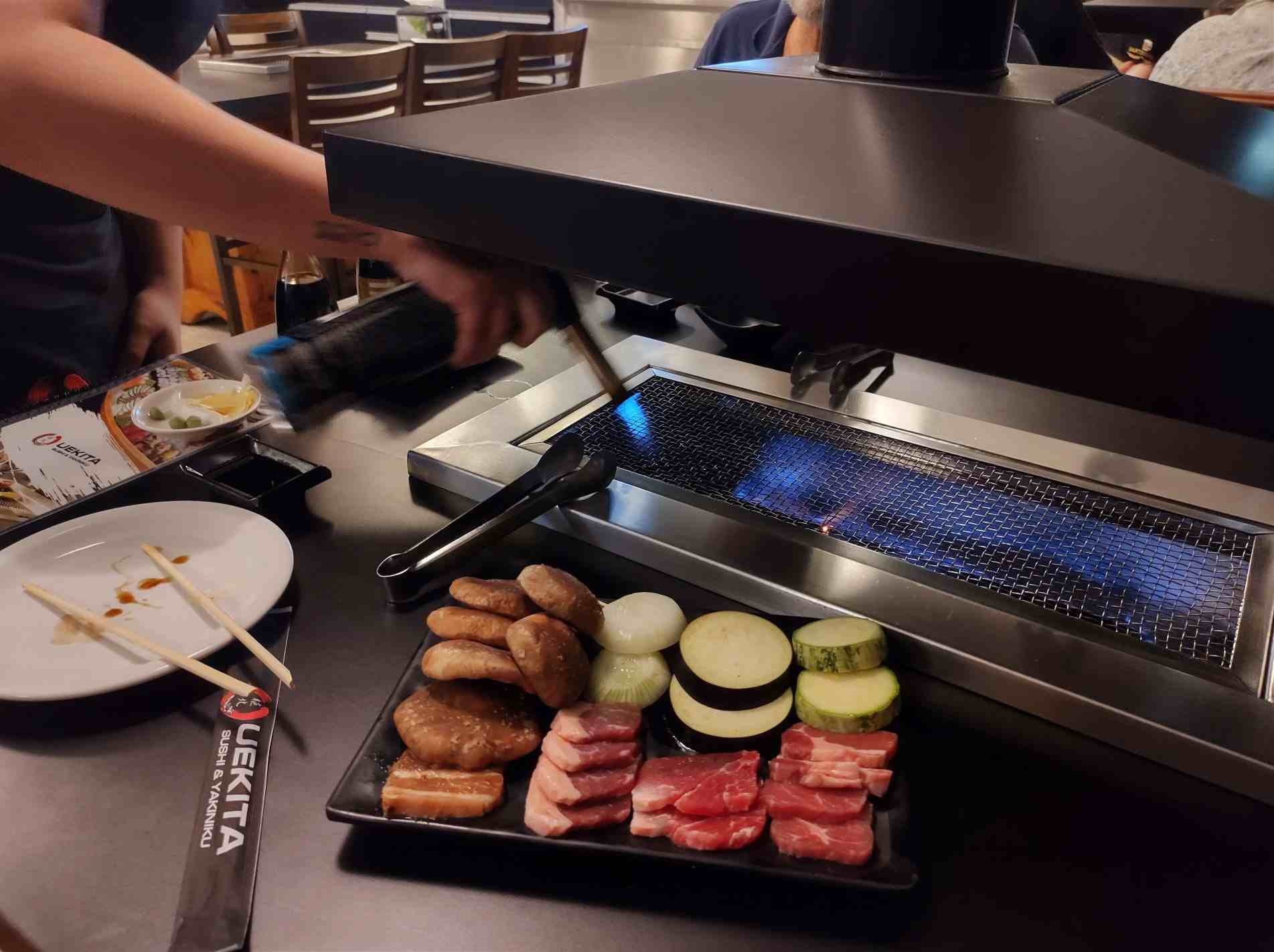 Você já ouviu falar em churrasco japonês? Desde 2017, o Restaurante japonês Uekita oferece o yakiniku, o churrasco japonês. As carnes seguem o padrão de corte japonês e são servidas cruas, no sistema de rodízio e no tempo em que o cliente decide que cada porção deva ser servida. Outra característica é a mesa de yakinuki. Ela é estruturada com grelha a gás embutida no centro e coifa suspensa. Com as carnes cruas e a churrasqueira à mão, o próprio cliente controla seus assados.