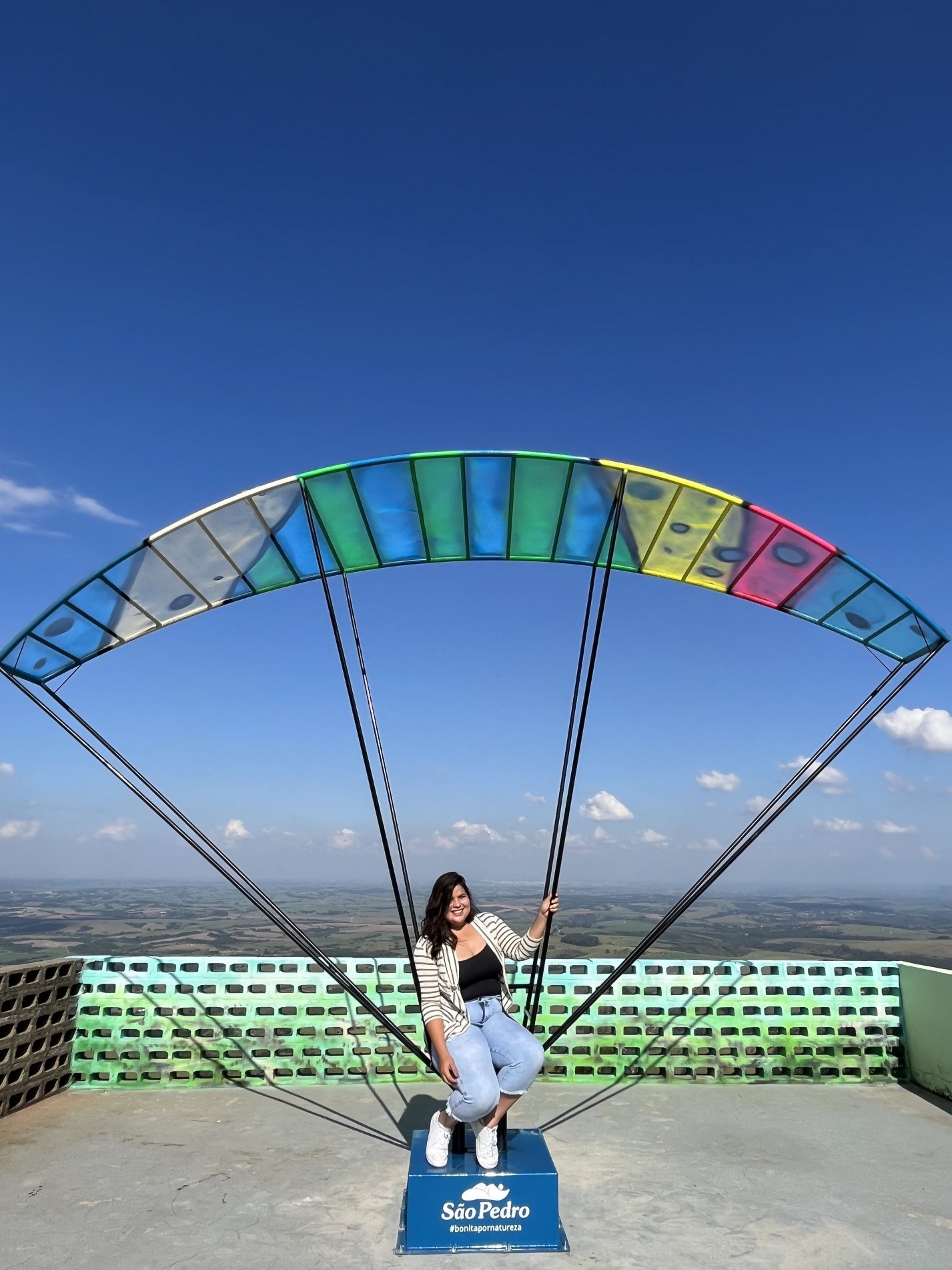 A escultura, do artista plástico Lajur, é de um parapente de cinco metros de largura por três metros de altura e está fixada em um mirante. Com asas de fibra de vidro e aço, foi projetada especialmente para o visitante se acomodar como se estivesse em um parapente de verdade, explica a secretária municipal de Turismo, Clarissa Quiararia. “Só acompanhar as decolagens, com aquela movimentação gostosa num lugar tão bonito, em contato com a natureza, já é um passeio. Agora, com a escultura, a gente faz a foto e aguça a vontade de voar de verdade”, diz a secretária.