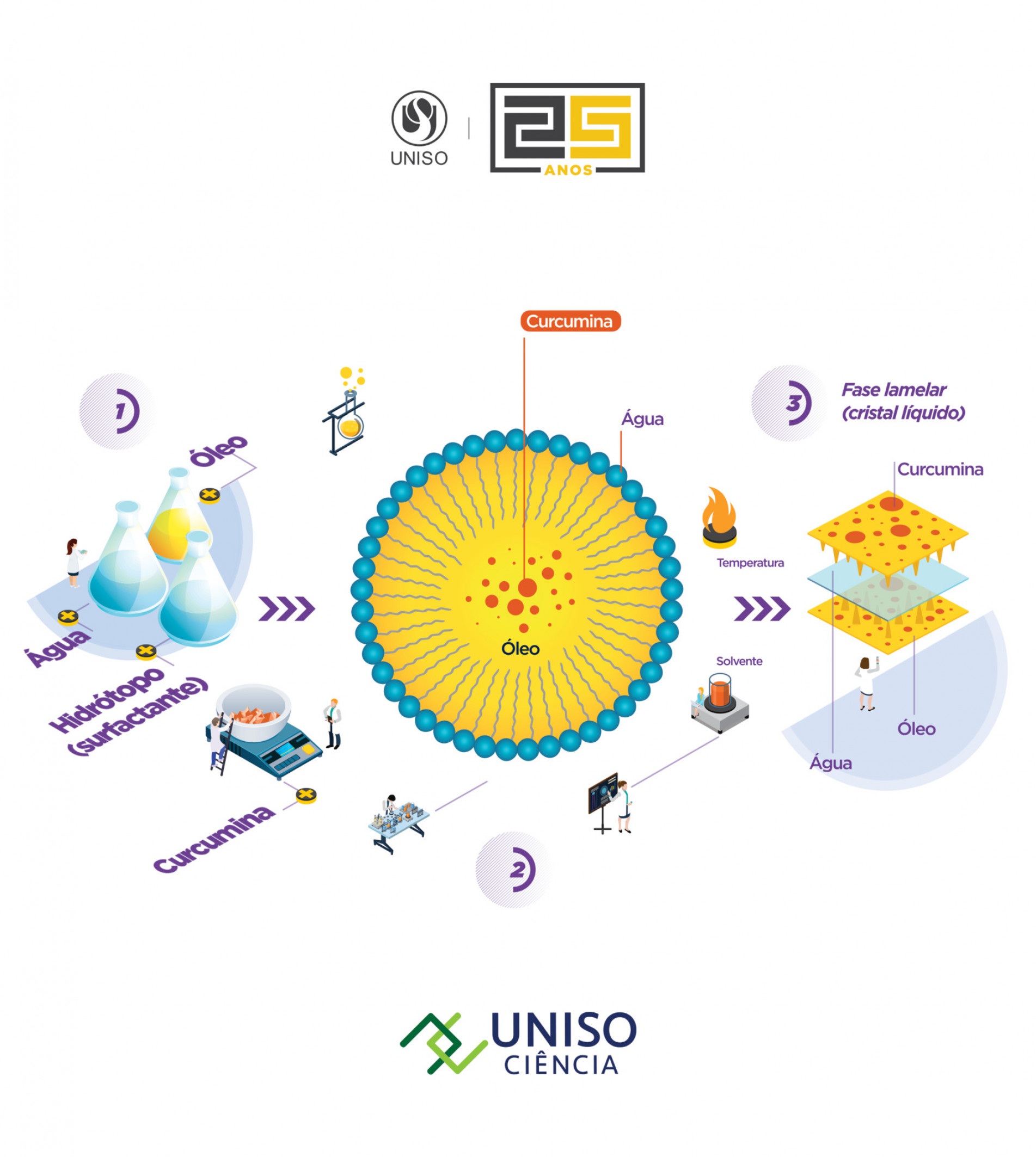 A essas emulsões, Souza acrescentou a curcumina. Por ter solubilidade limitada na água, a curcumina se liga à fase oleosa da emulsão. Quando a temperatura aumenta (36-37ºC), em laboratório ou potencialmente em contato com o corpo humano, as moléculas se rearranjam num novo padrão (de uma estrutura micelar para uma estrutura lamelar, em camadas delgadas semelhantes às células humanas), com comportamento de cristais líquidos. Assim, a curcumina fica duplamente protegida, pela fase oleosa e pelas várias camadas que formam o cristal líquido resultante.