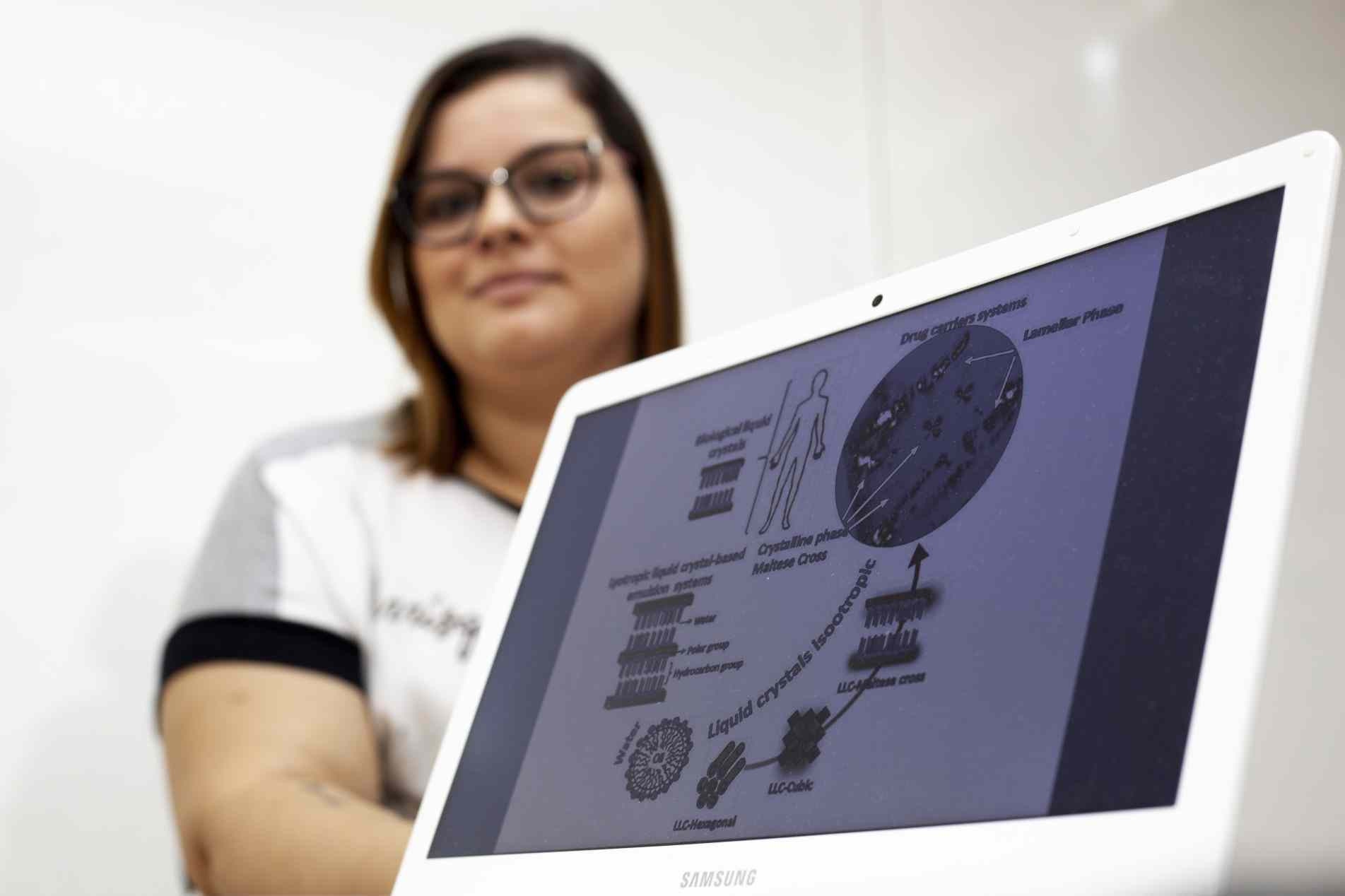 Em sua pesquisa, Souza formulou um cristal líquido biomimético que pode ser usado para a liberação controlada de um fármaco específico, a curcumina. Ela explica que a curcumina é uma substância com propriedades antibióticas, antioxidantes, anti-inflamatórias e cicatrizantes, que está normalmente sujeita à degradação oxidativa pela exposição à luz e ao calor. Encapsular a curcumina no cristal líquido é uma forma de protegê-la, garantindo que ela se mantenha íntegra durante a estocagem e biologicamente ativa até chegar ao local do corpo humano onde suas propriedades terapêuticas deverão se manifestar. Para isso, Souza criou uma forma de cristal líquido a partir de uma emulsão de lipídios em meio aquoso.
