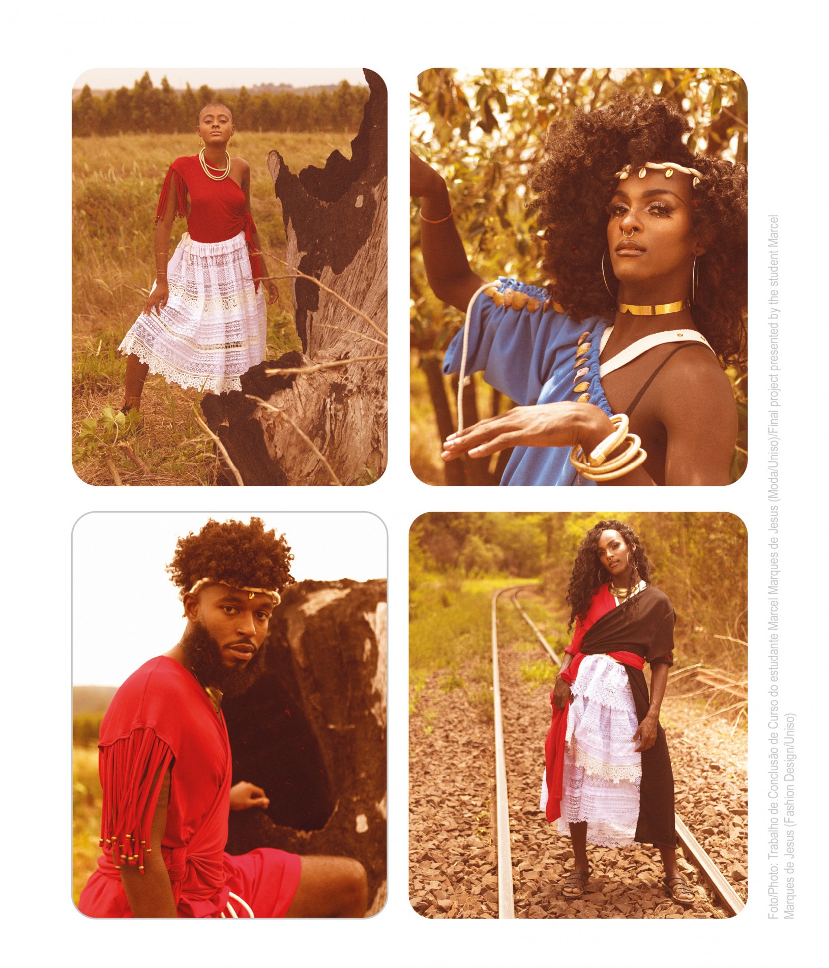 Para Jesus, que não se identifica como negro, mas vem de uma família bastante miscigenada (incluindo uma avó negra), a inspiração africana não se resumiu ao desfile. Posteriormente, em 2020, ele defendeu o seu Trabalho de Conclusão de Curso (TCC), orientado por Okasaki e inspirado tanto em movimentos negros periféricos do Brasil quanto por outra religião sincrética de origem africana, a umbanda, que nasceu no início do século XX, no Rio de Janeiro. “Durante a minha graduação em Moda — que na verdade é a minha segunda faculdade (a primeira foi em Jornalismo, também na Uniso) —, tive um despertar para as questões sociais brasileiras. A motivação para o meu trabalho foi muito simples: foi este racismo estrutural que a gente experimenta diariamente no Brasil. O que mais me motivou foi o fato de eu experimentar esse apagamento da cultura de origem africana na minha vida, na minha própria criação. Este foi o momento de eu olhar para tudo isso e falar ‘Esta é a minha cultura’, porque o Brasil também é África, já que a nossa cultura bebeu muito da cultura africana desde a época colonial”, ele explica. Além da pesquisa bibliográfica, seu TCC incluiu uma coleção original de oito peças, totalizando cinco looks completos.