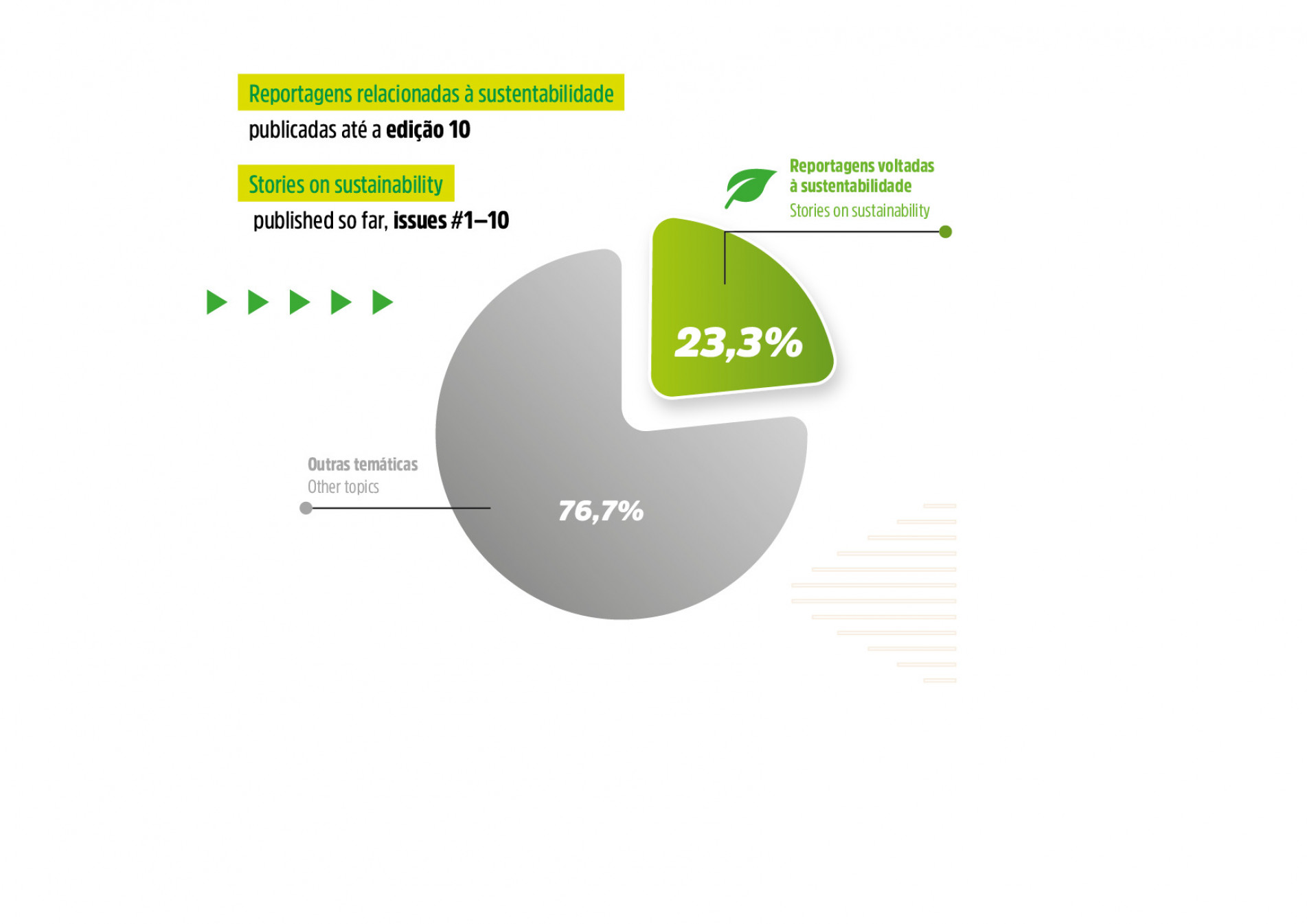 Vale destacar, também, a importância que vem sendo dada nesta publicação para as pautas sobre sustentabilidade; de fato, considerando-se todas as reportagens vinculadas a essa temática (incluindo ações institucionais em prol do meio ambiente, educação ambiental, biodiversidade, biorremediação e recursos hídricos, processos produtivos mais sustentáveis e mudanças climáticas), tem-se nada menos do que 23,3% de todas as reportagens já publicadas.